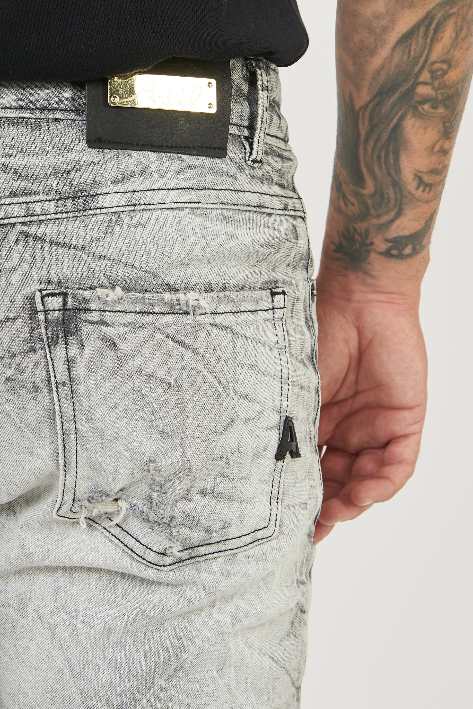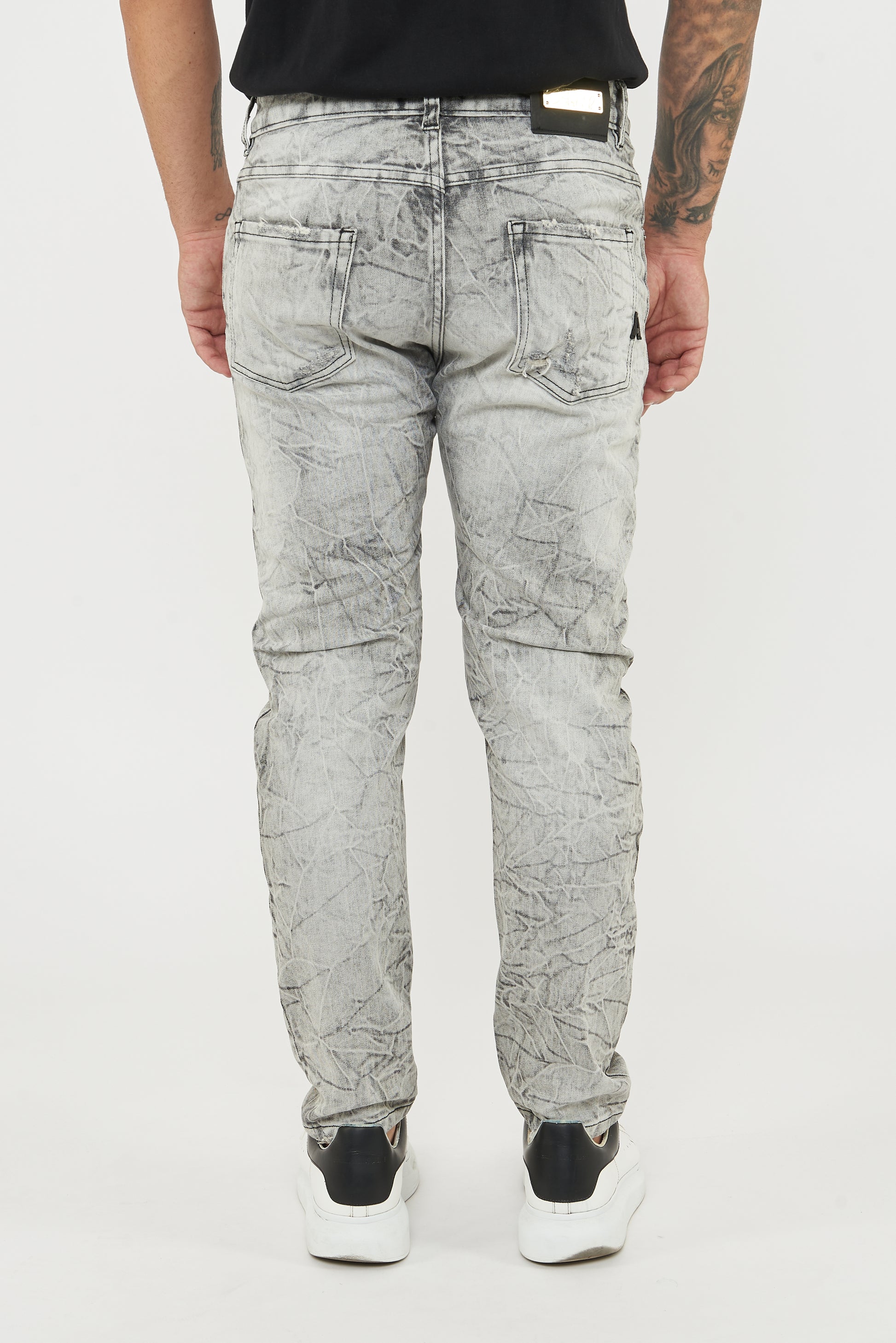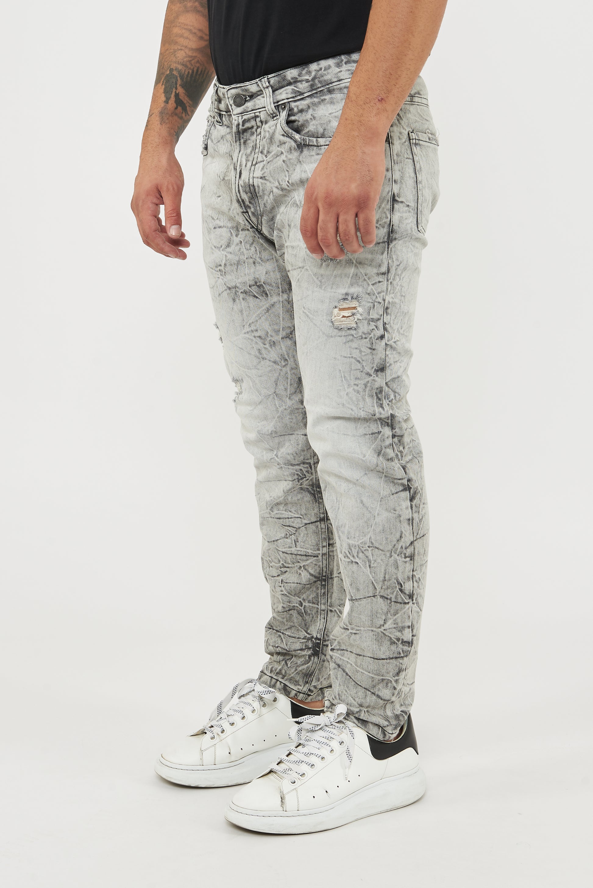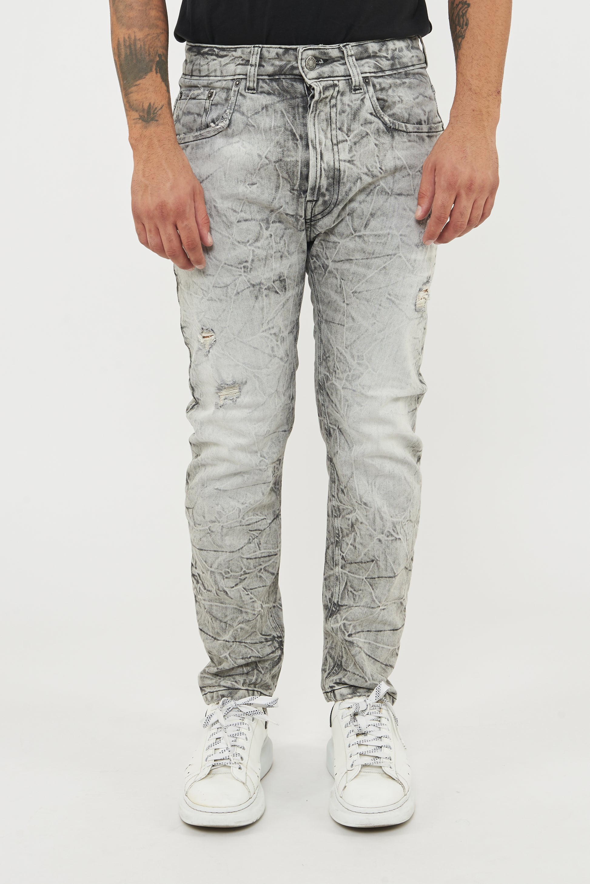 Comfortable black canvas jeans with a relaxed fit. A marbled wash effect; thanks to this process, black-based jeans can be turned a light gray with internal stains that give them a worn-in look.