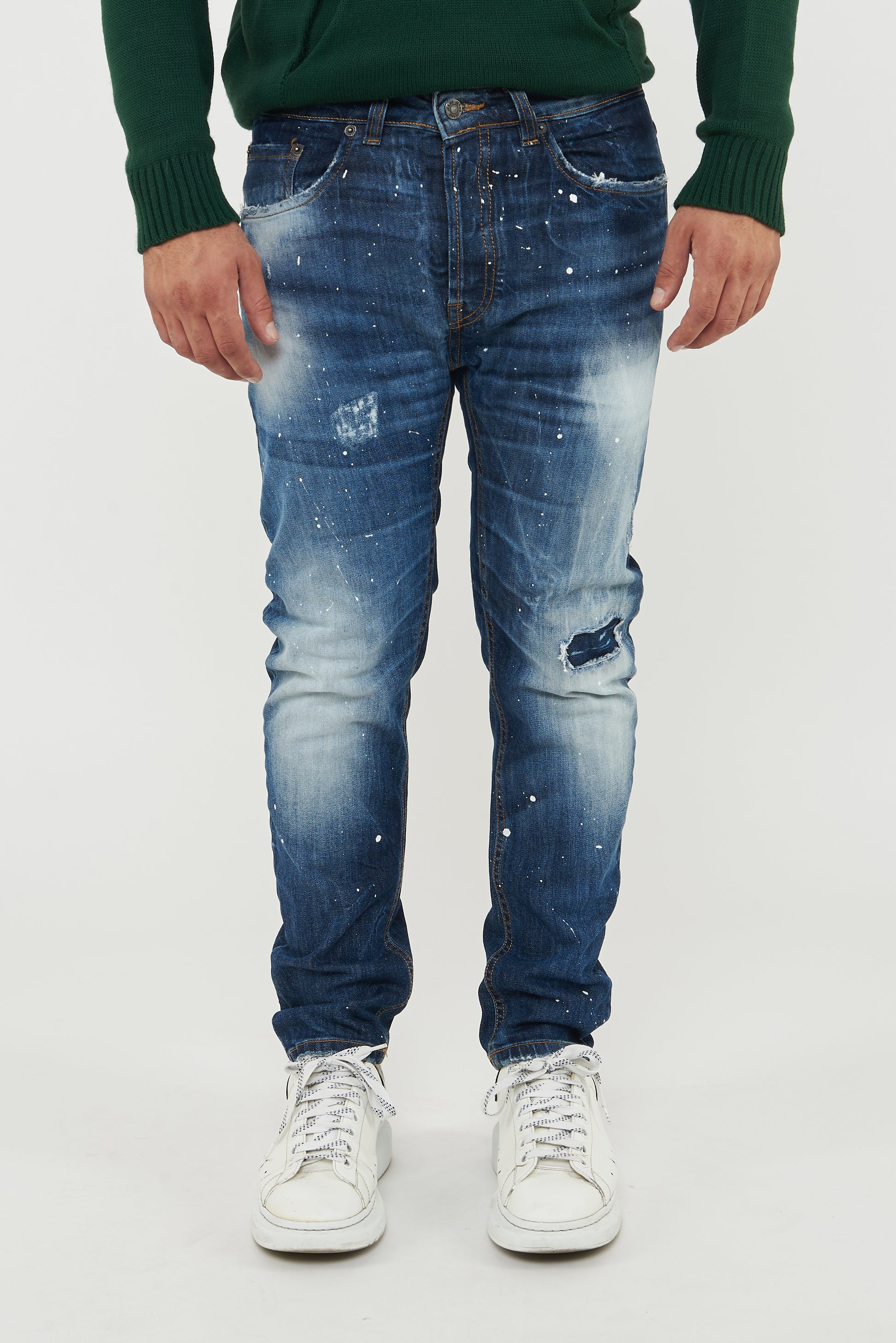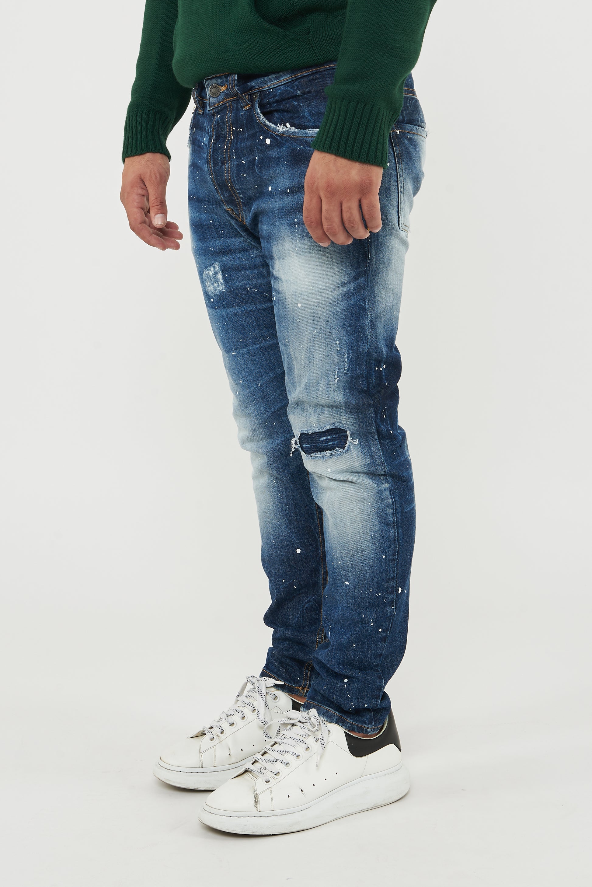 Comfort fit jeans in blue canvas. Washed effect with binding, contrasting denim patch underneath, with micro tears and white splashes.