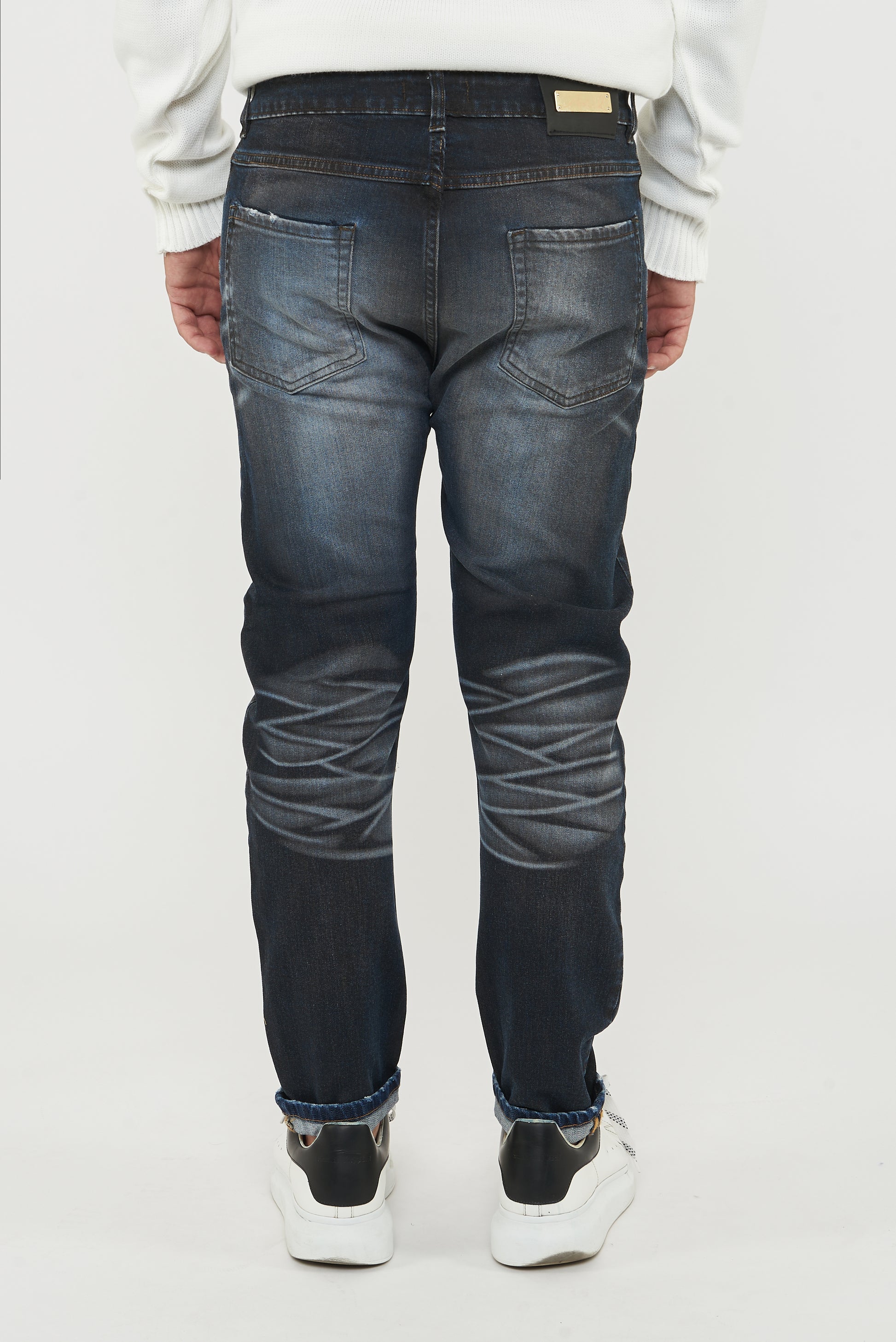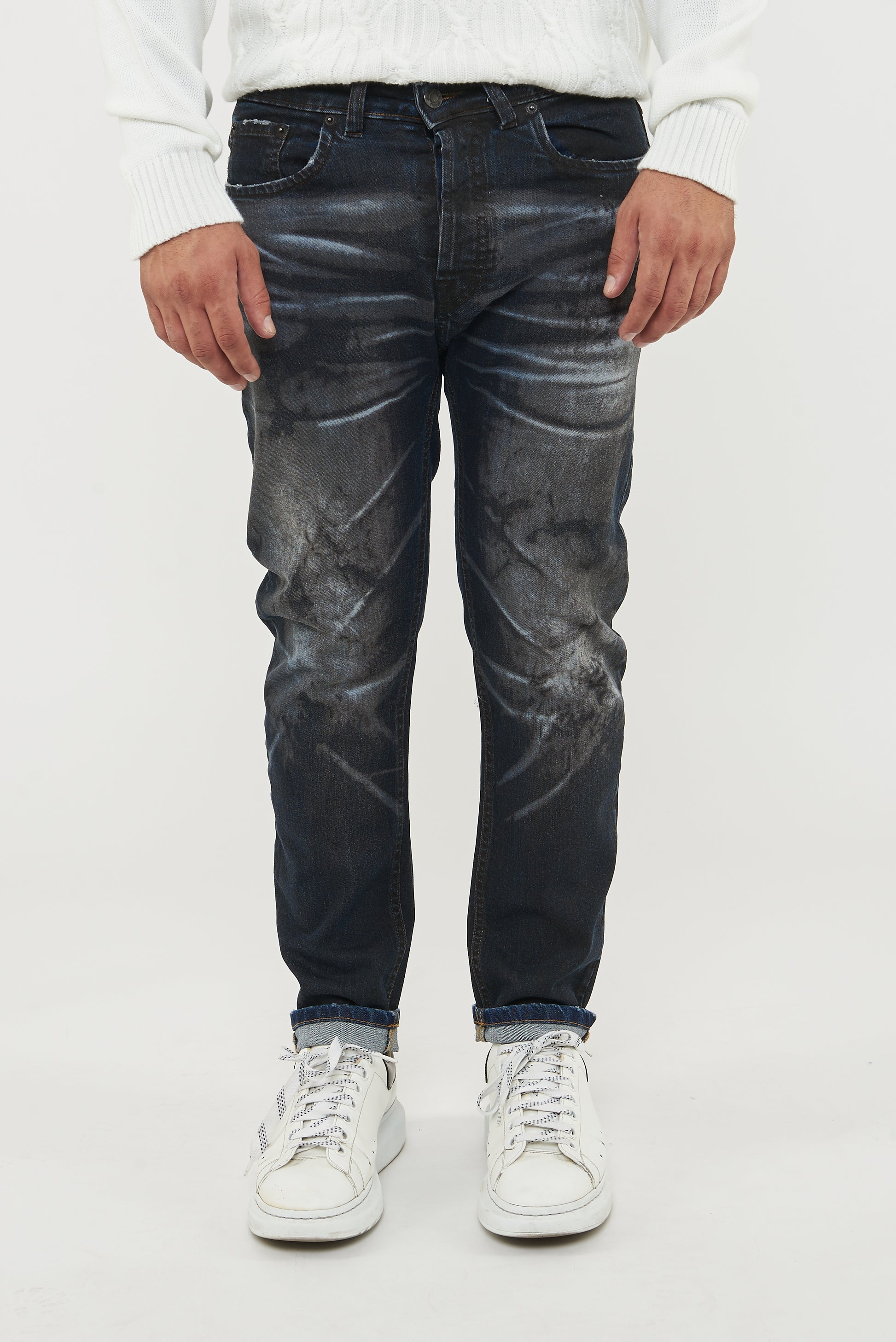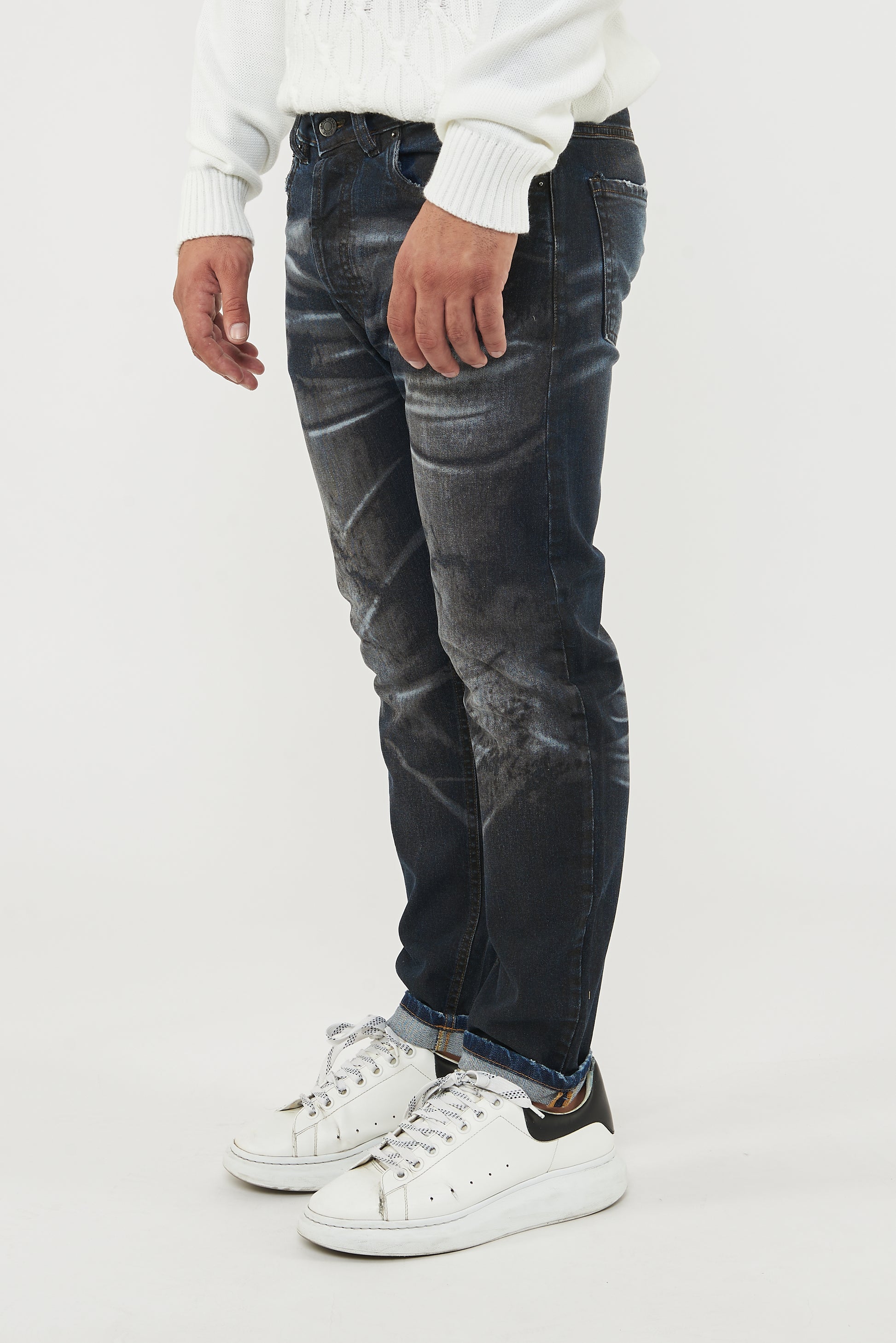 Jeans su tela comfort di colore blu con una vestibilità morbida.Effetto lavaggio 3D laser , ciò che differenza questo jeans e che la base è blu , essendo trattato con dei trattamenti particolari,più un trattamento di polverina nera gli da un effetto black