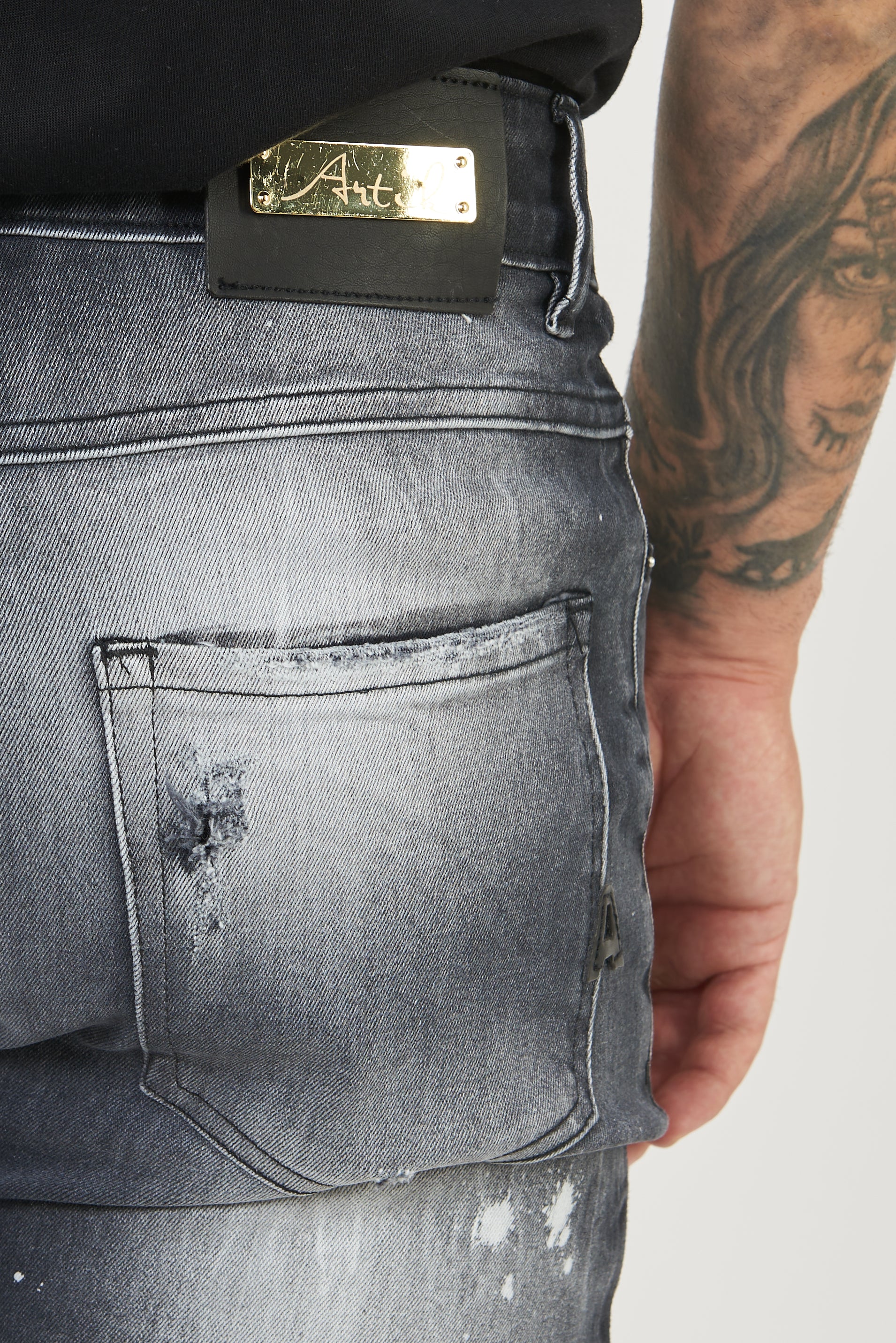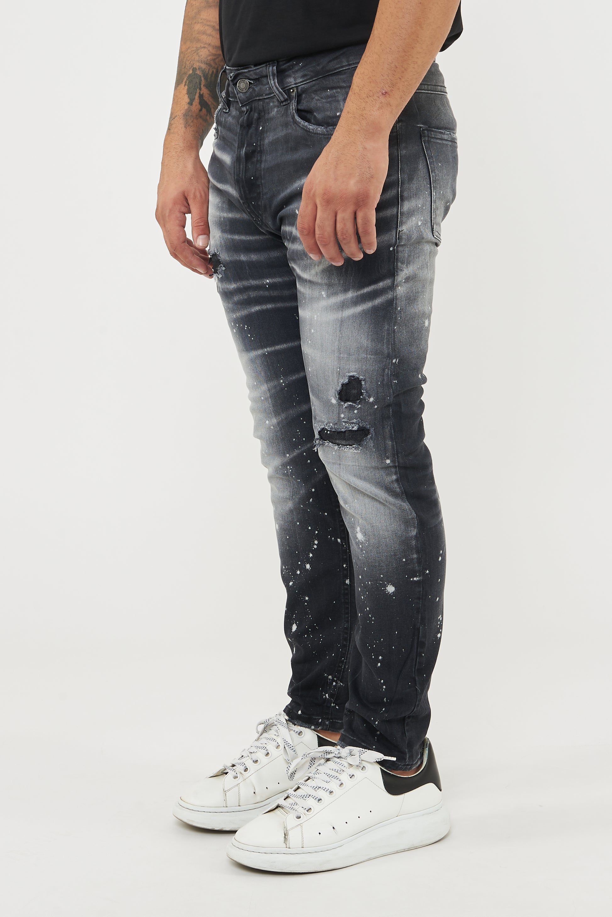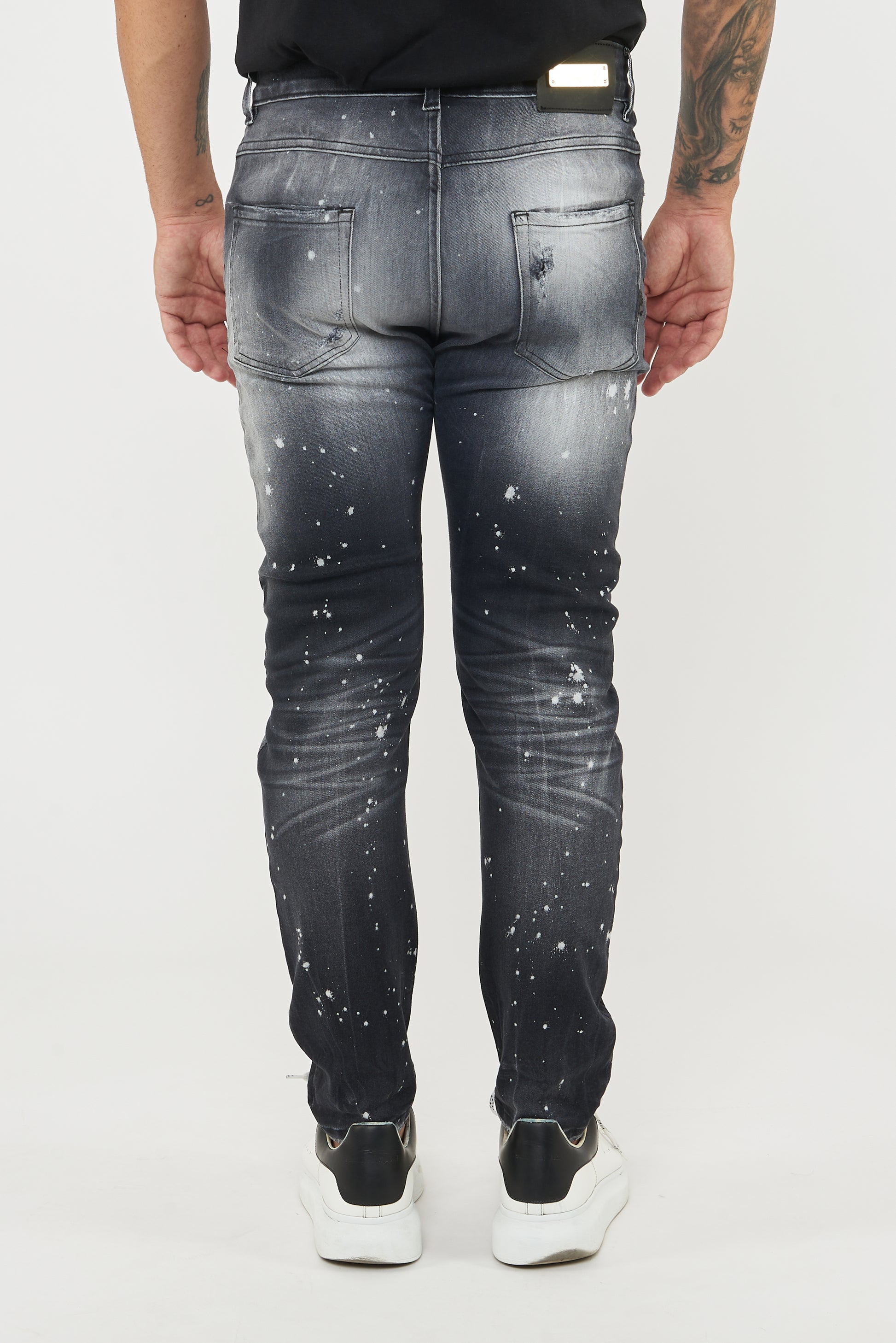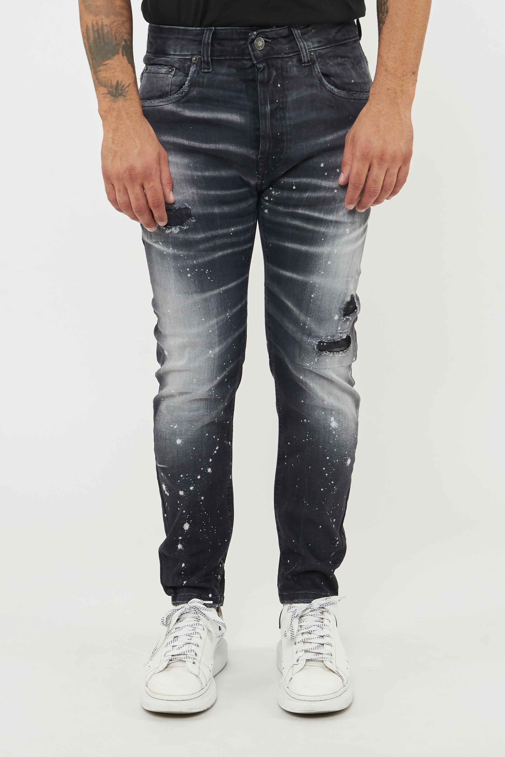 Jeans su tela comfort di colore black black con una vestibilità morbida. Effetto lavaggio black black con spruzzo all’ozono , toppe sottostanti di colore nero , schizzi di cloro colore bianco.