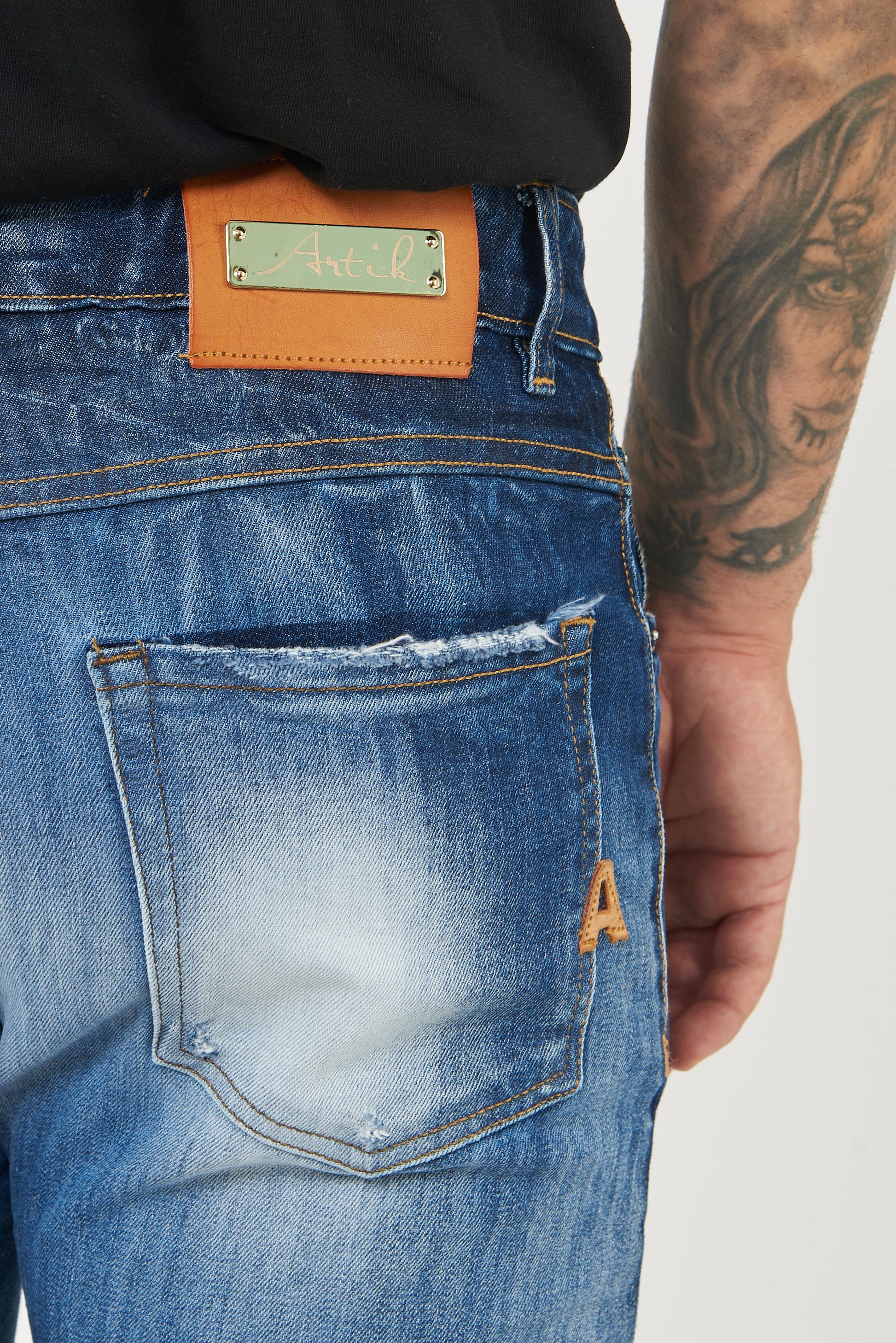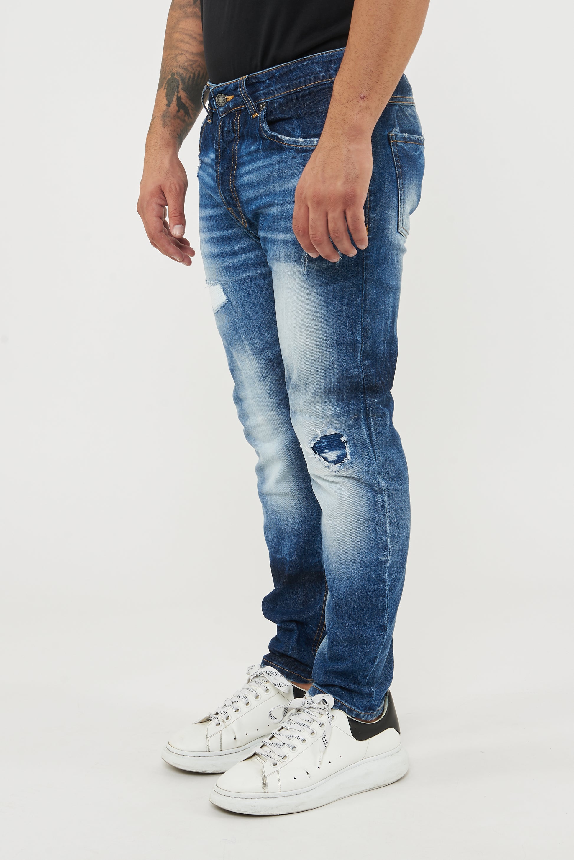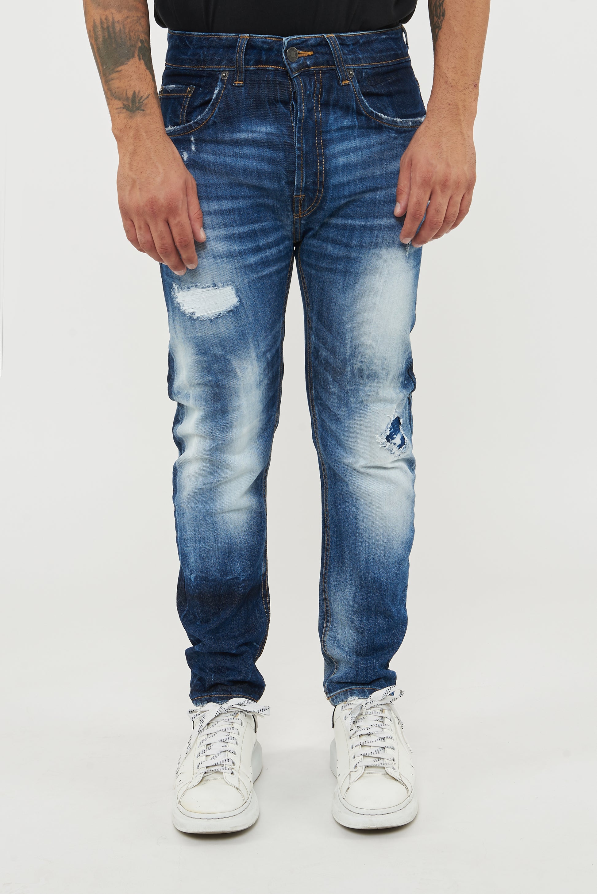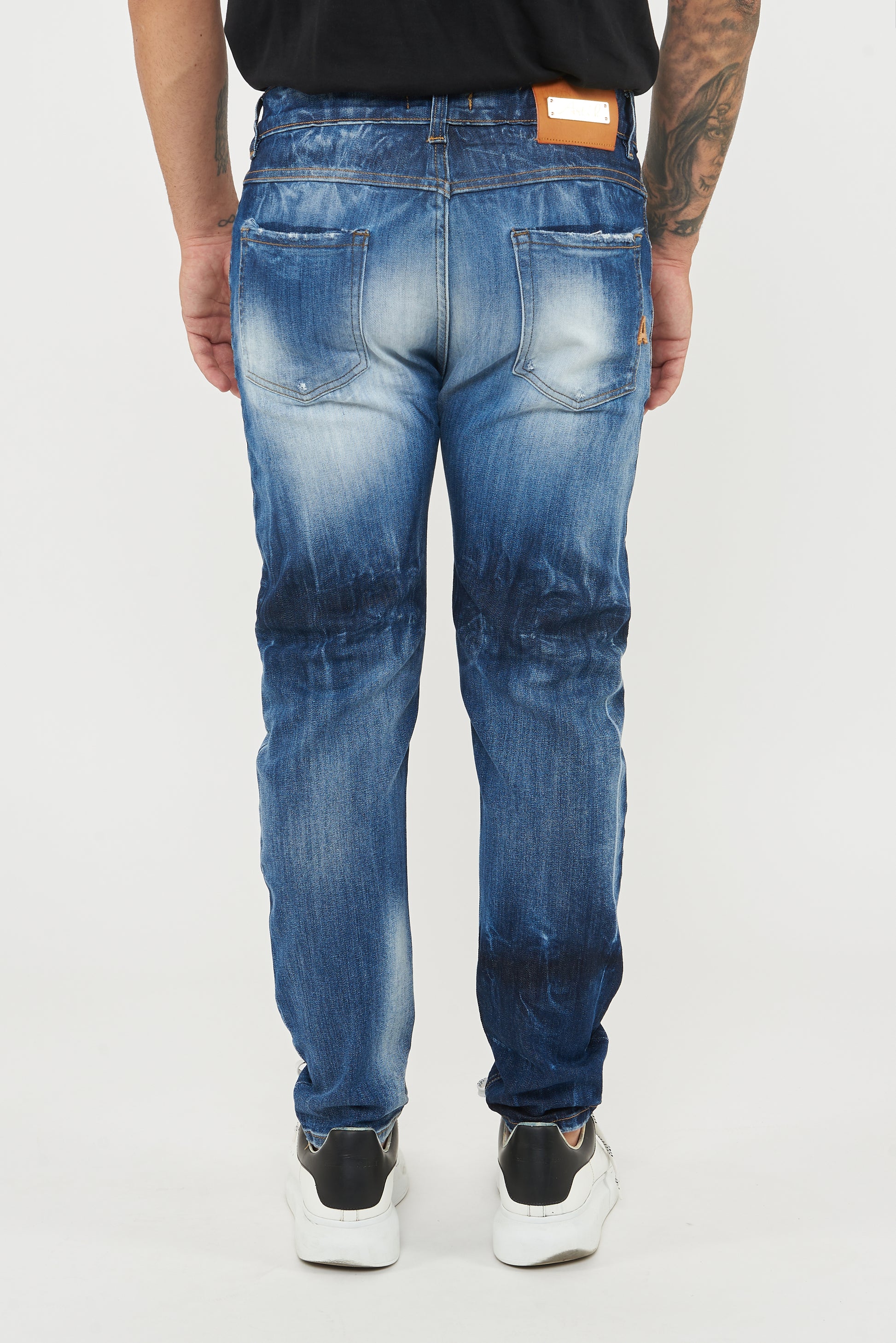 Jeans su tela comfort di colore blu con una vestibilità morbida. Effetto lavaggio blu , con trattamento di legatura che all’occhio da l’effetto chiaro/scuro , con toppe di telina bianca più toppa di jeans .