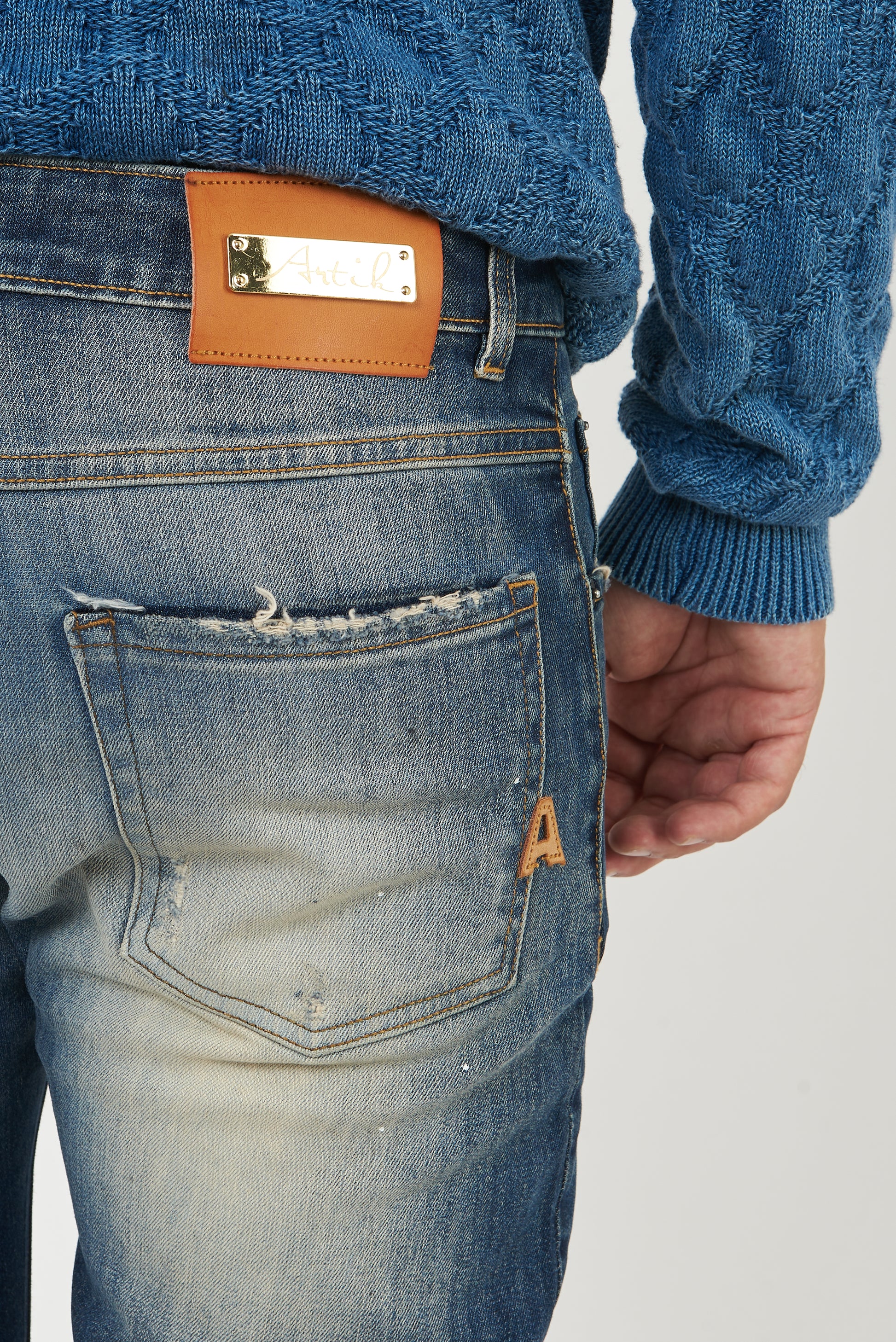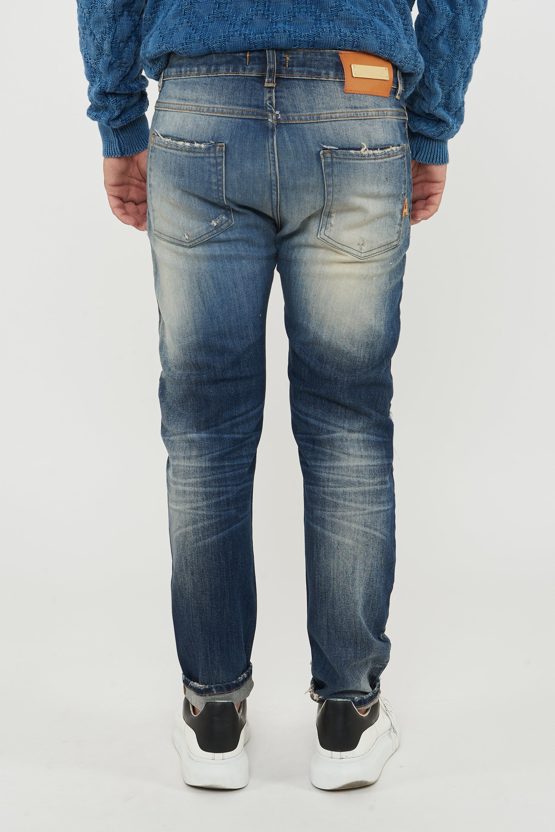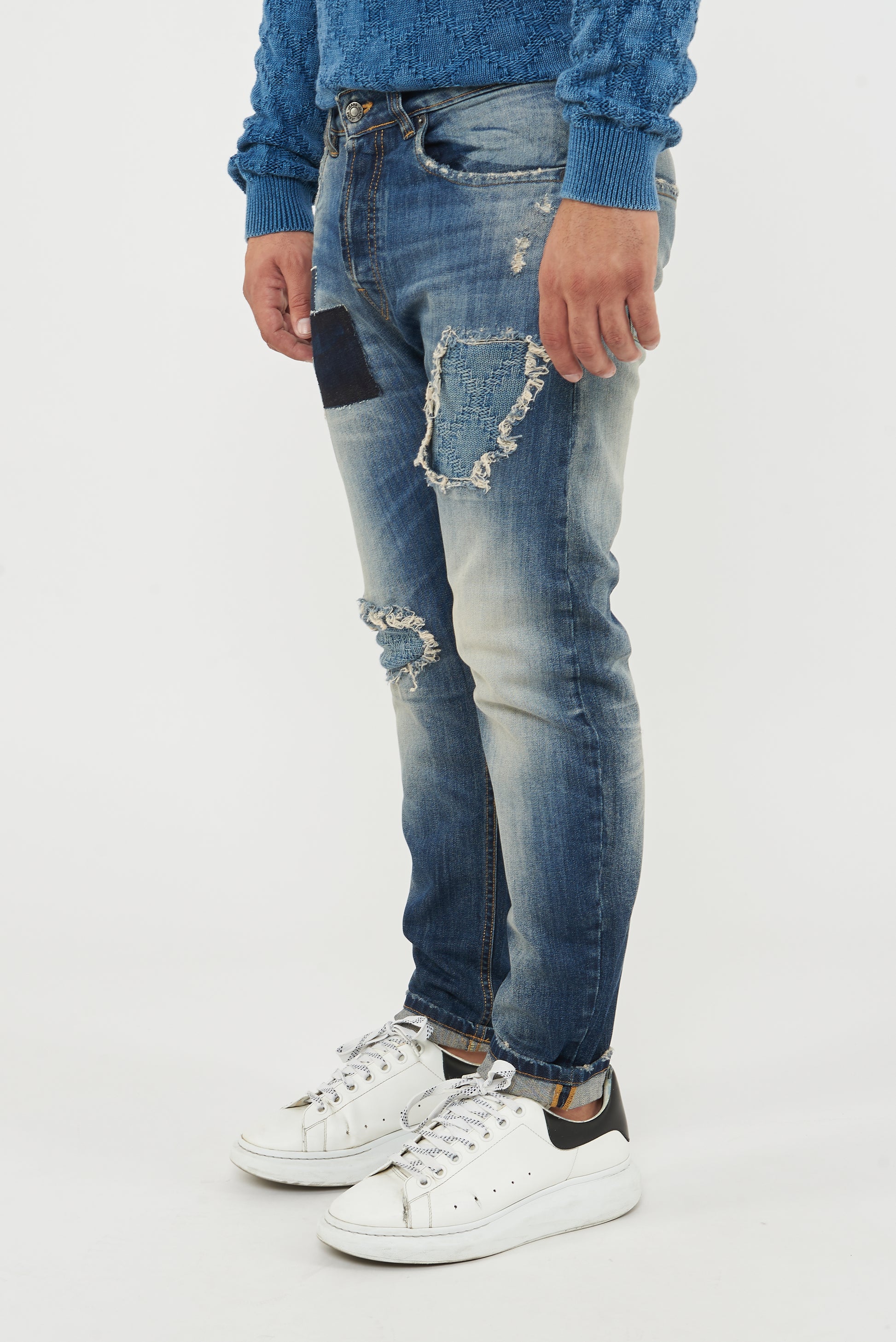 Jeans su tela comfort di colore blu con una vestibilità morbida.Effetto lavaggio blu sporcato a thè , che con l’inserimento delle toppe di materiale “ maglina “ va a differenziarsi da ciò che si vede in giro , abbiamo anche due toppe sovrapposte in due varianti di colore che danno un tocco strong al capo e lo rendono unico nel suo valore .