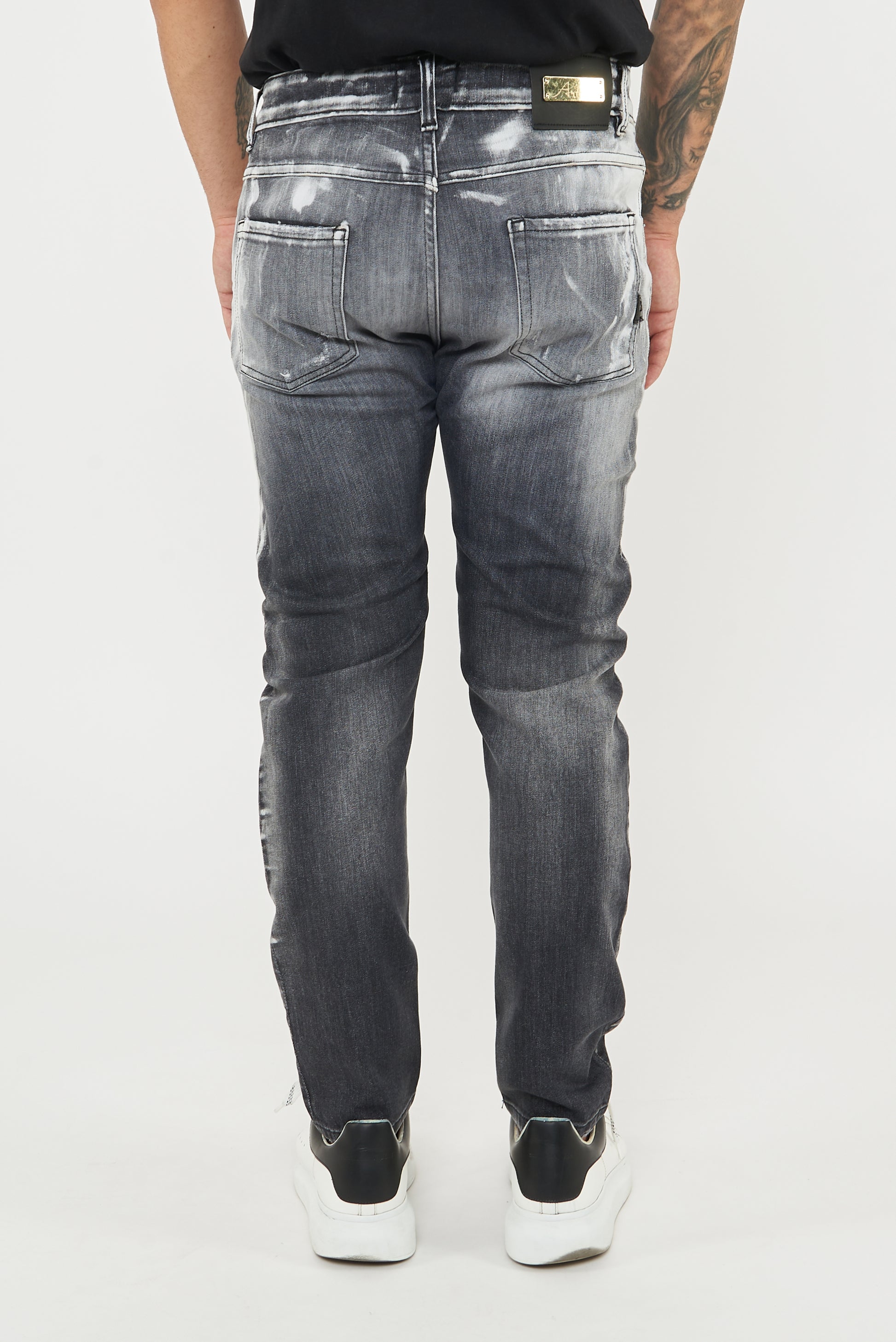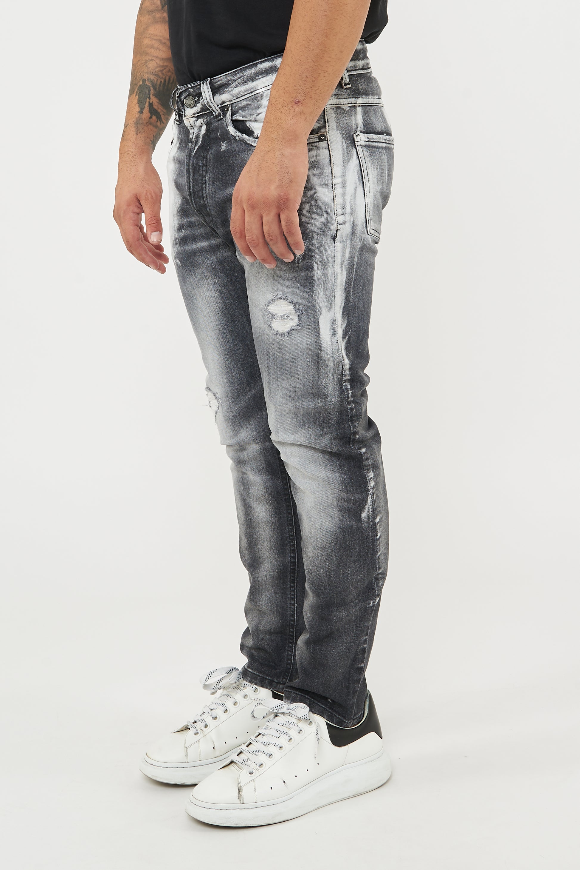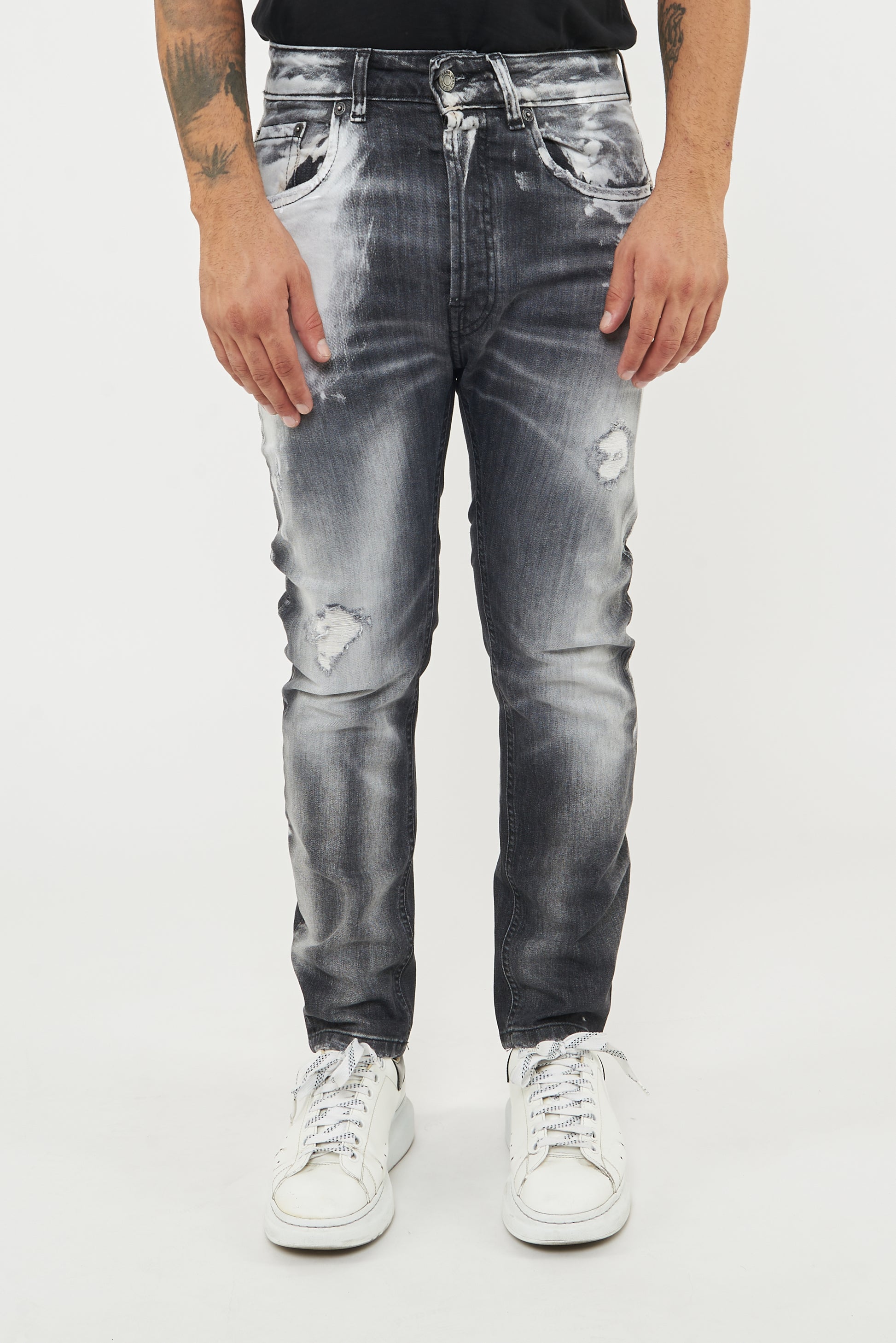 Jeans su tela comfort di colore nero con una vestibilità morbida. Effetto lavaggio nero con cloro localizzato bianco , toppa telina bianca sottostante alla rottura