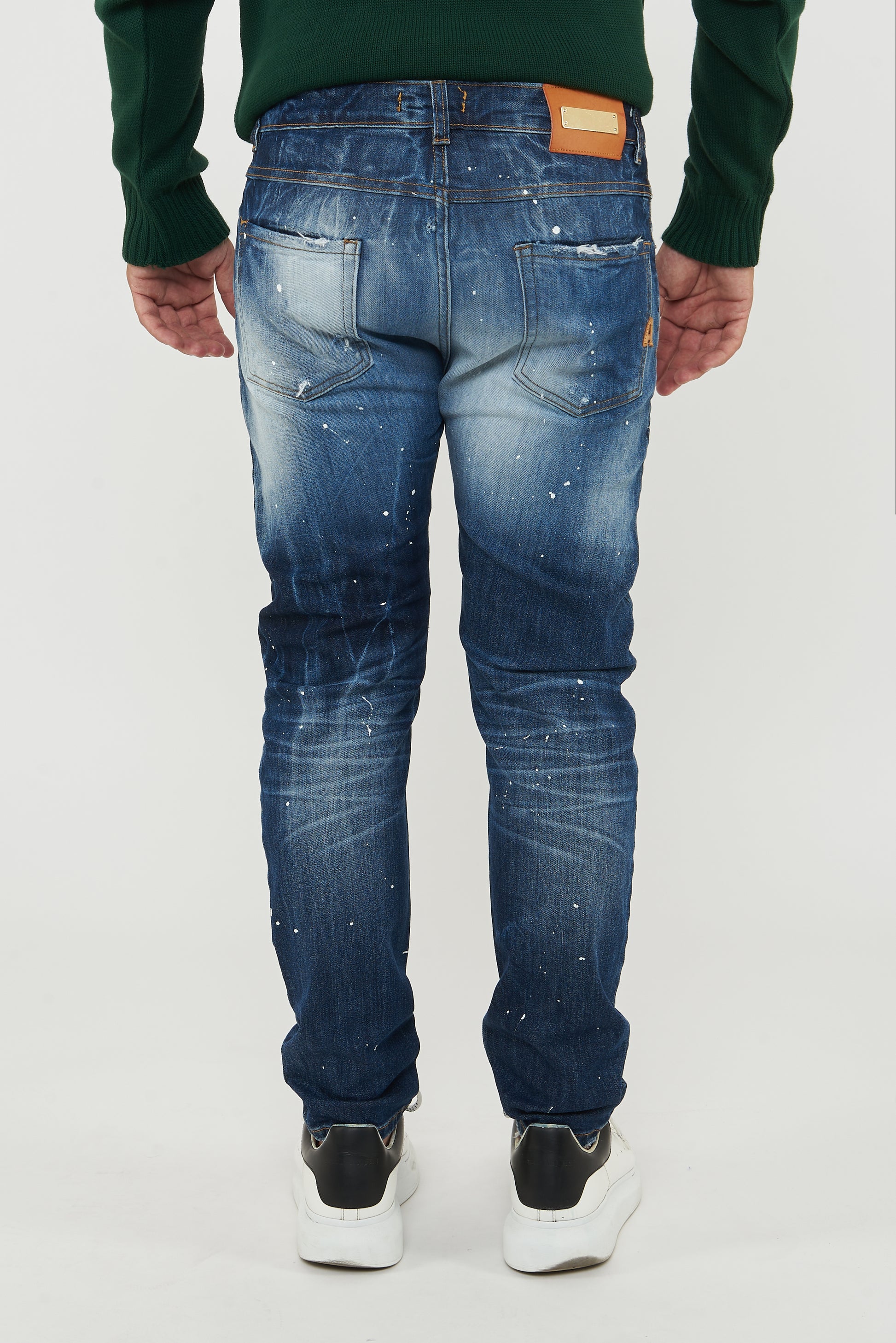 Jeans su tela comfort di colore blu con una vestibilità morbida.Effetto lavaggio con legatura,toppa di jeans sottostante a contrasto , con microrotture e schizzi bianchi.