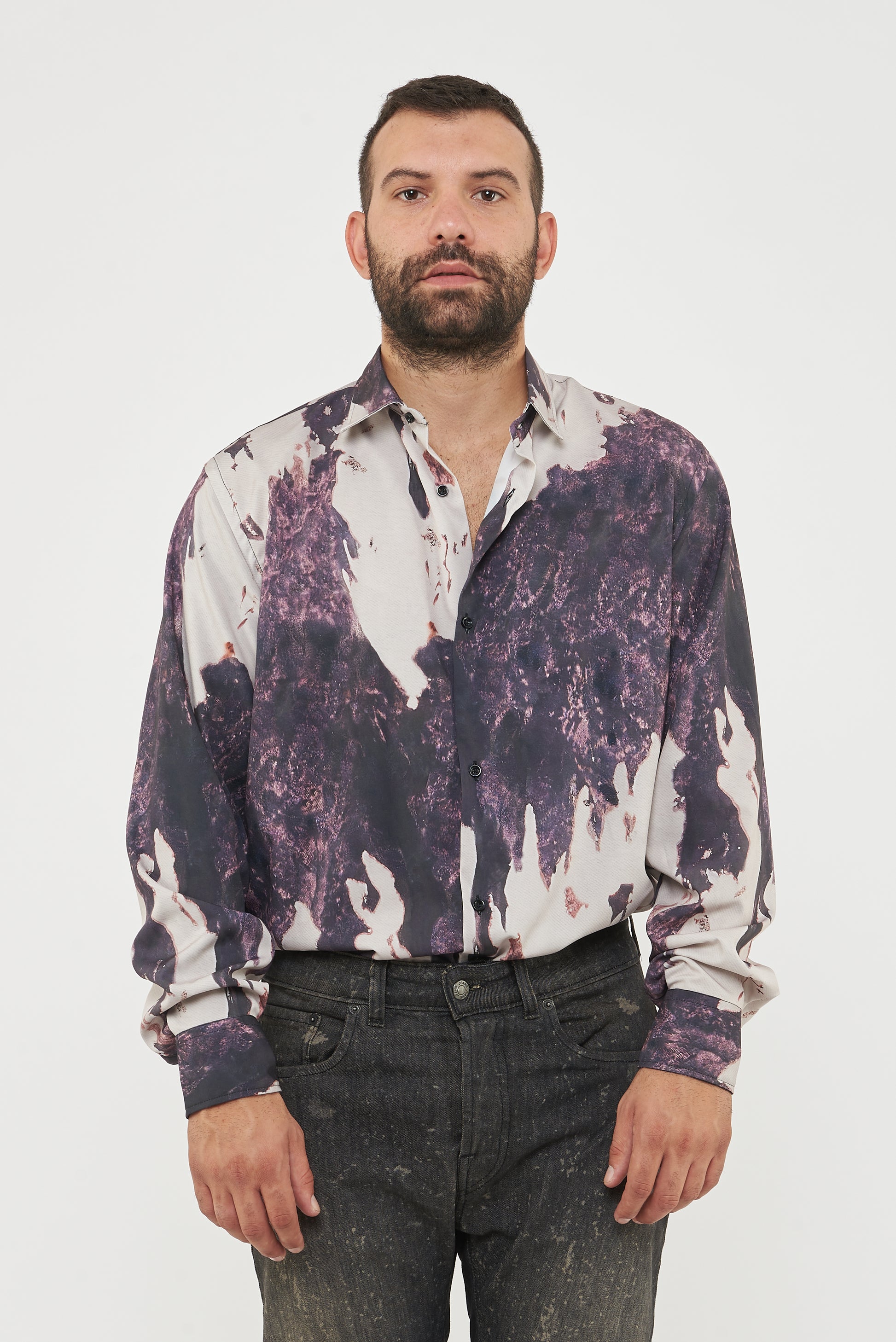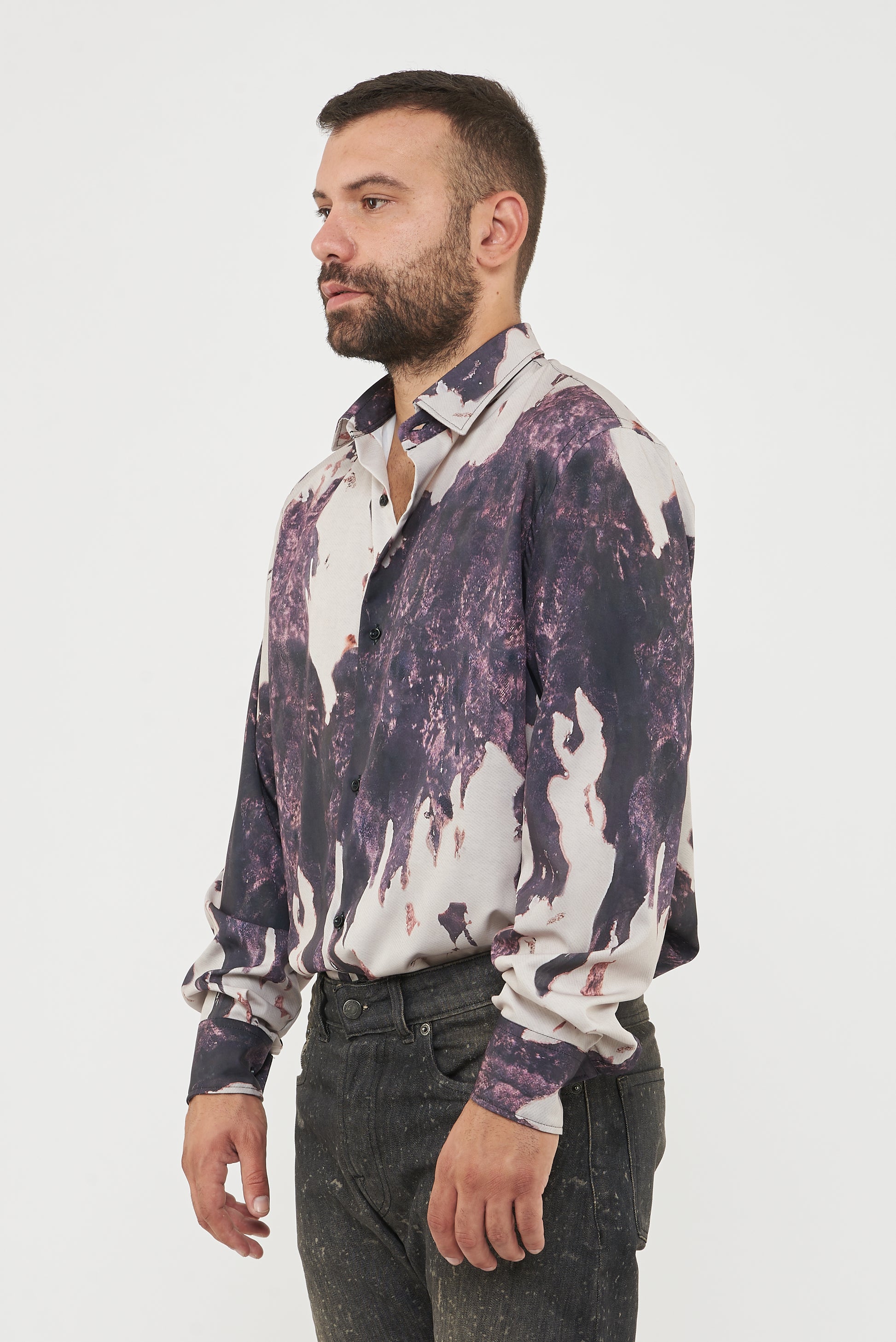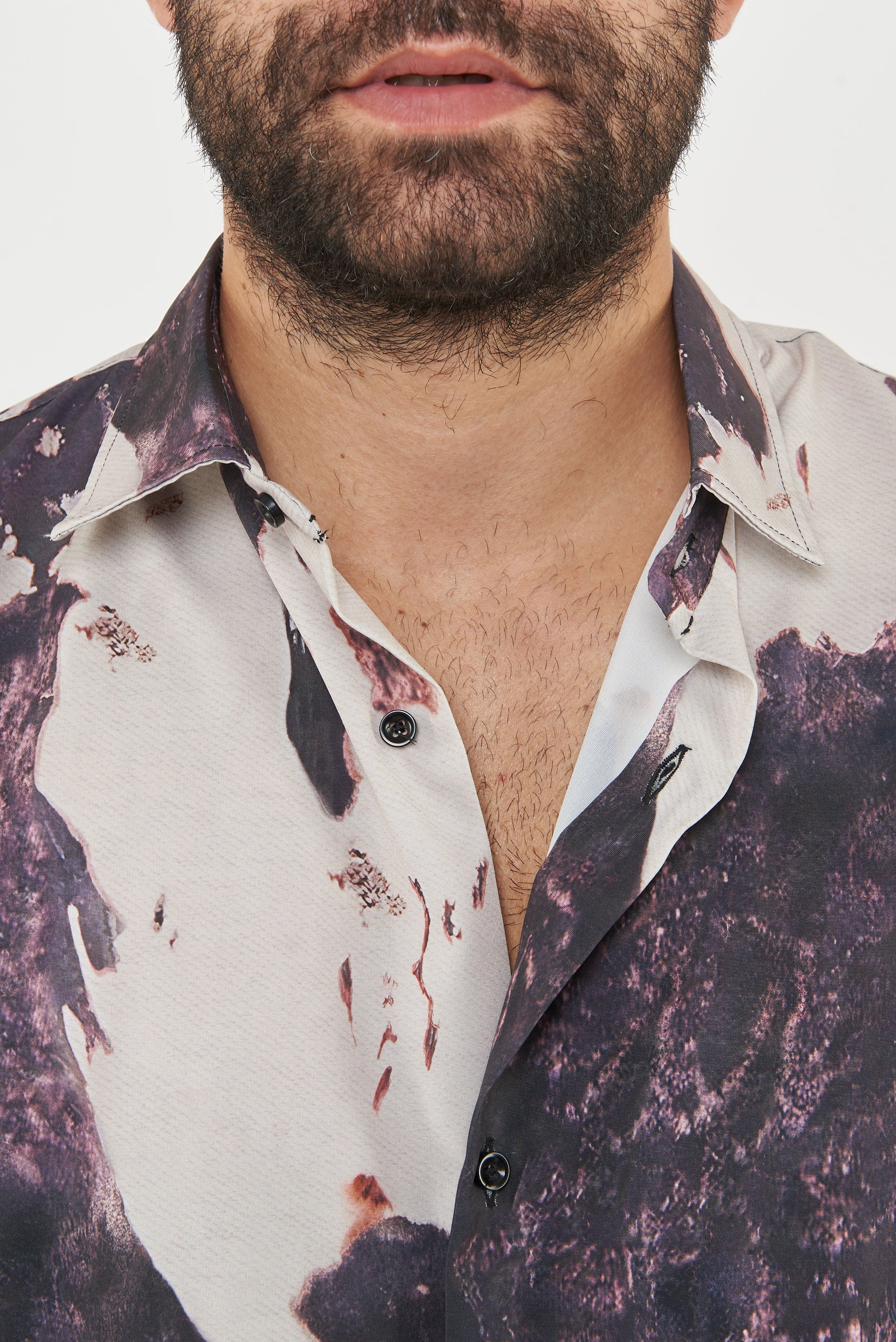 Questa camicia unisce eleganza e originalità grazie alla sua stampa astratta effetto pittorico nei toni del viola e del bianco . Realizzata in tessuto viscosa e morbido al tatto , presenta una vestibilità regolare con colletto classico e chiusura frontale con bottoni. Perfetta per chi cerca un capo versatile che si distingue,ideale sia per un look casual raffinati che per outfit serali dal carattere deciso.
