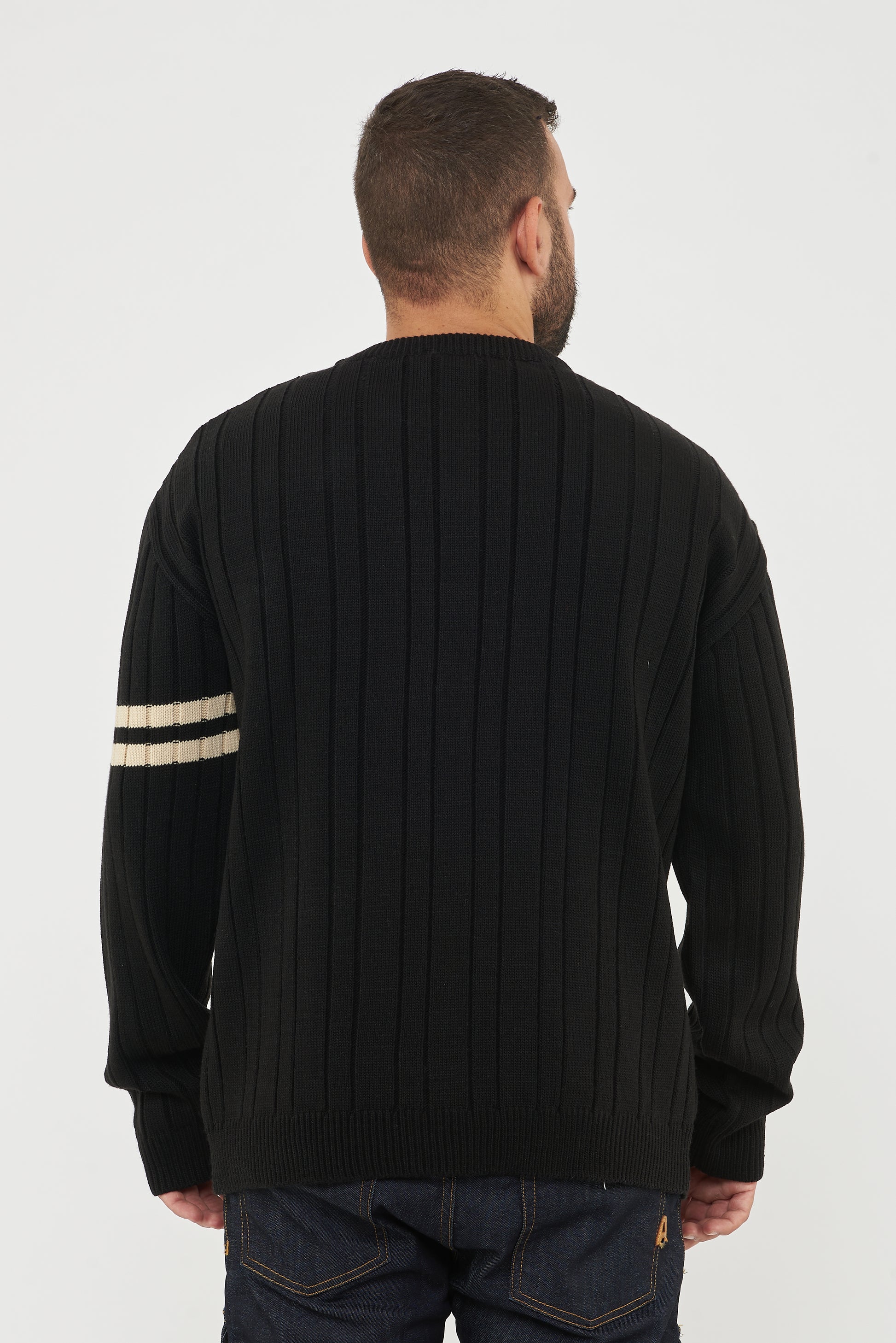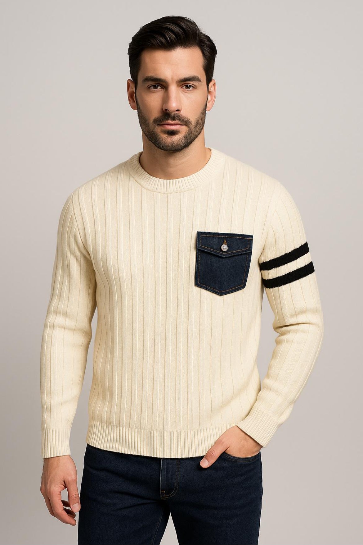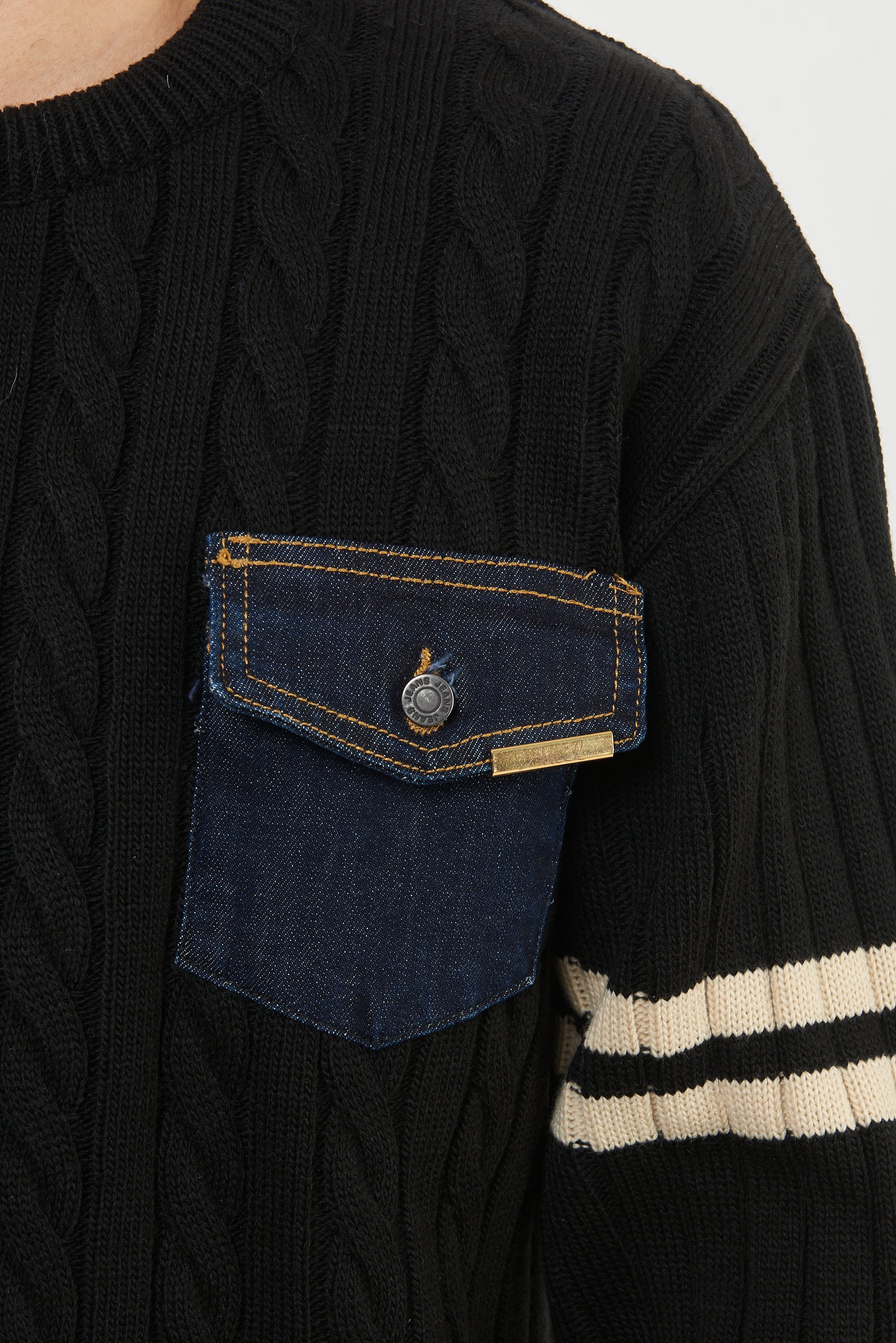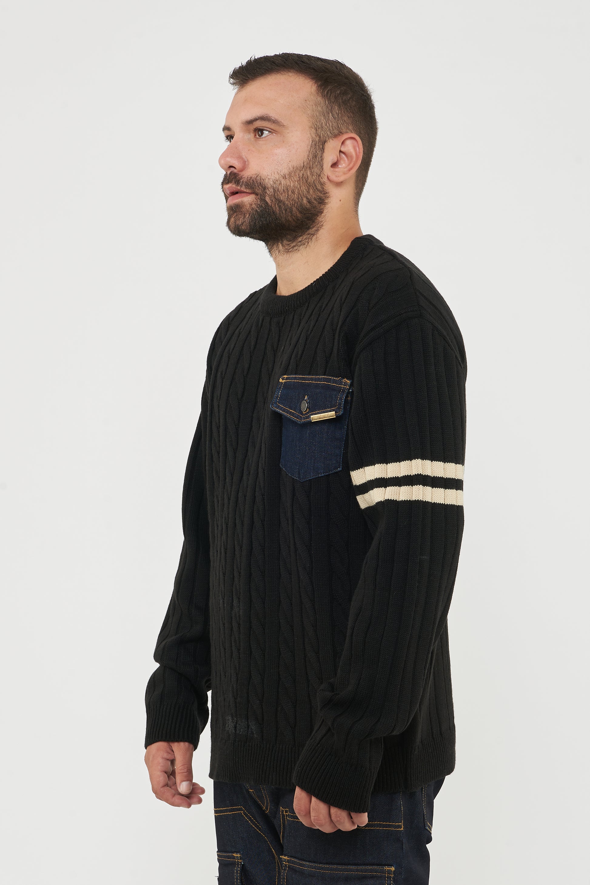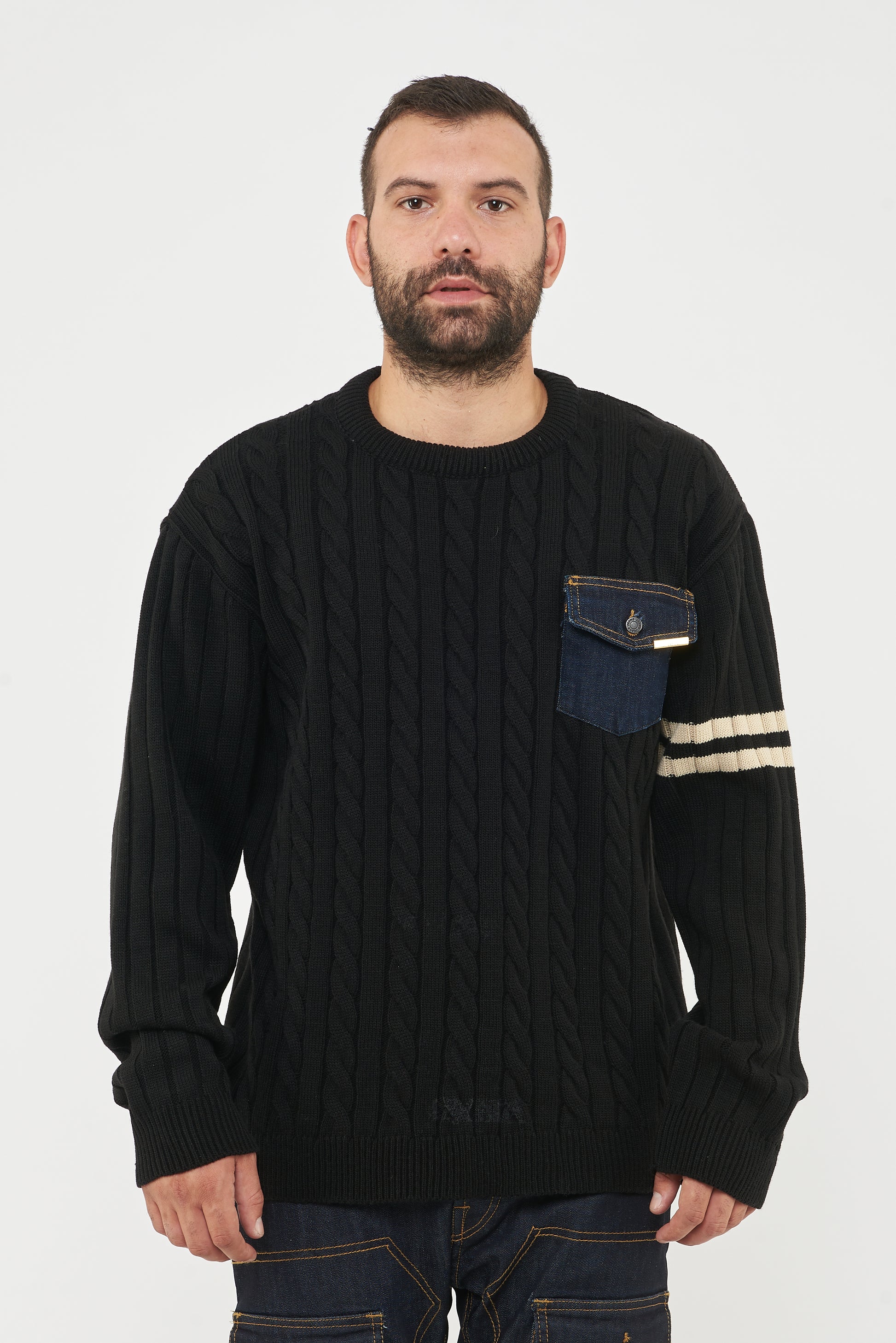 Maglione a trecce ,caratterizzato da un design moderno e sportivo.Dettaglio distintivo : taschino in denim con patta e targhetta in metallo logata , che dona un tocco originale e casual. La manica sinistra è impreziosita da due righe orizzontali color panna , che aggiungono un contrasto stiloso.