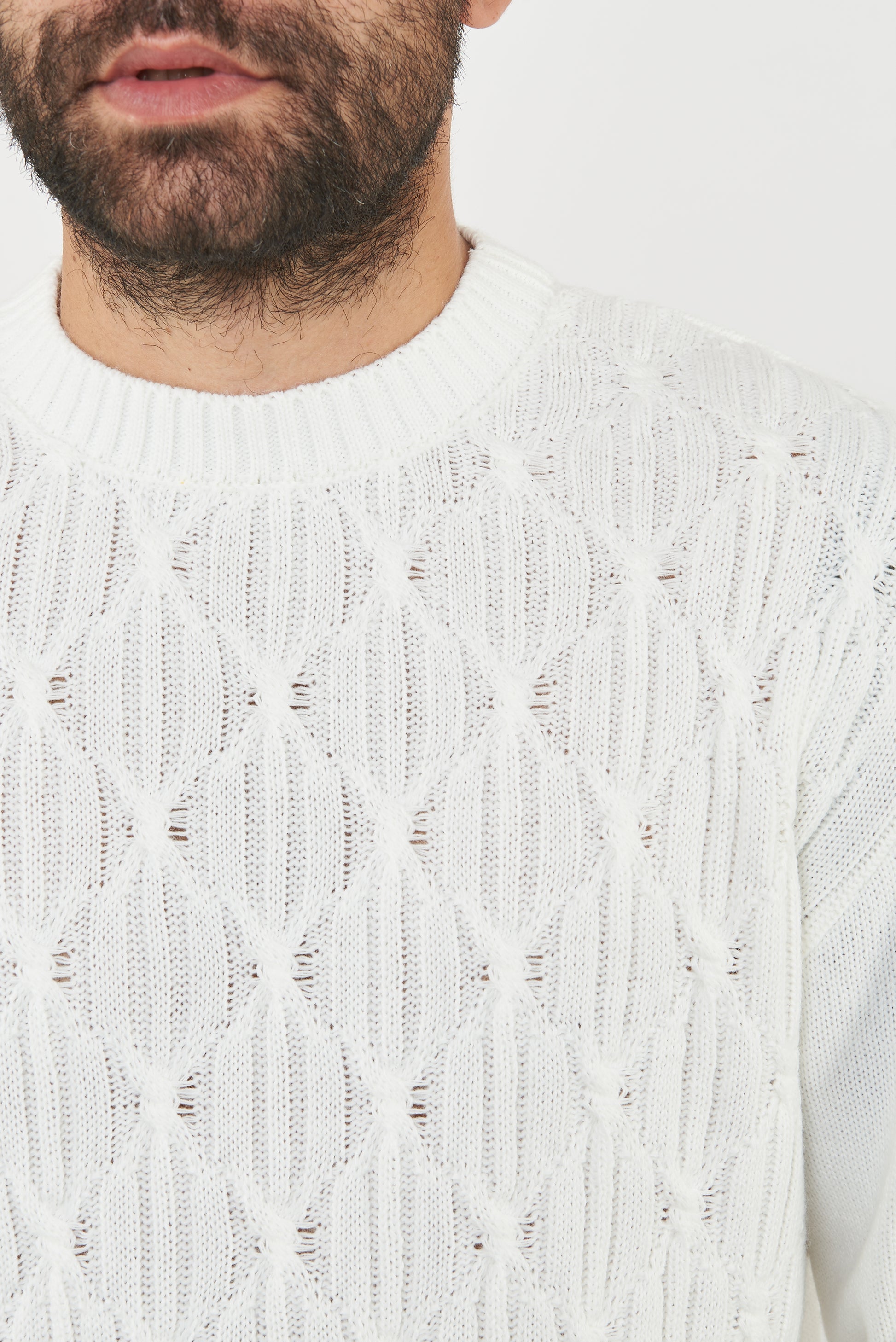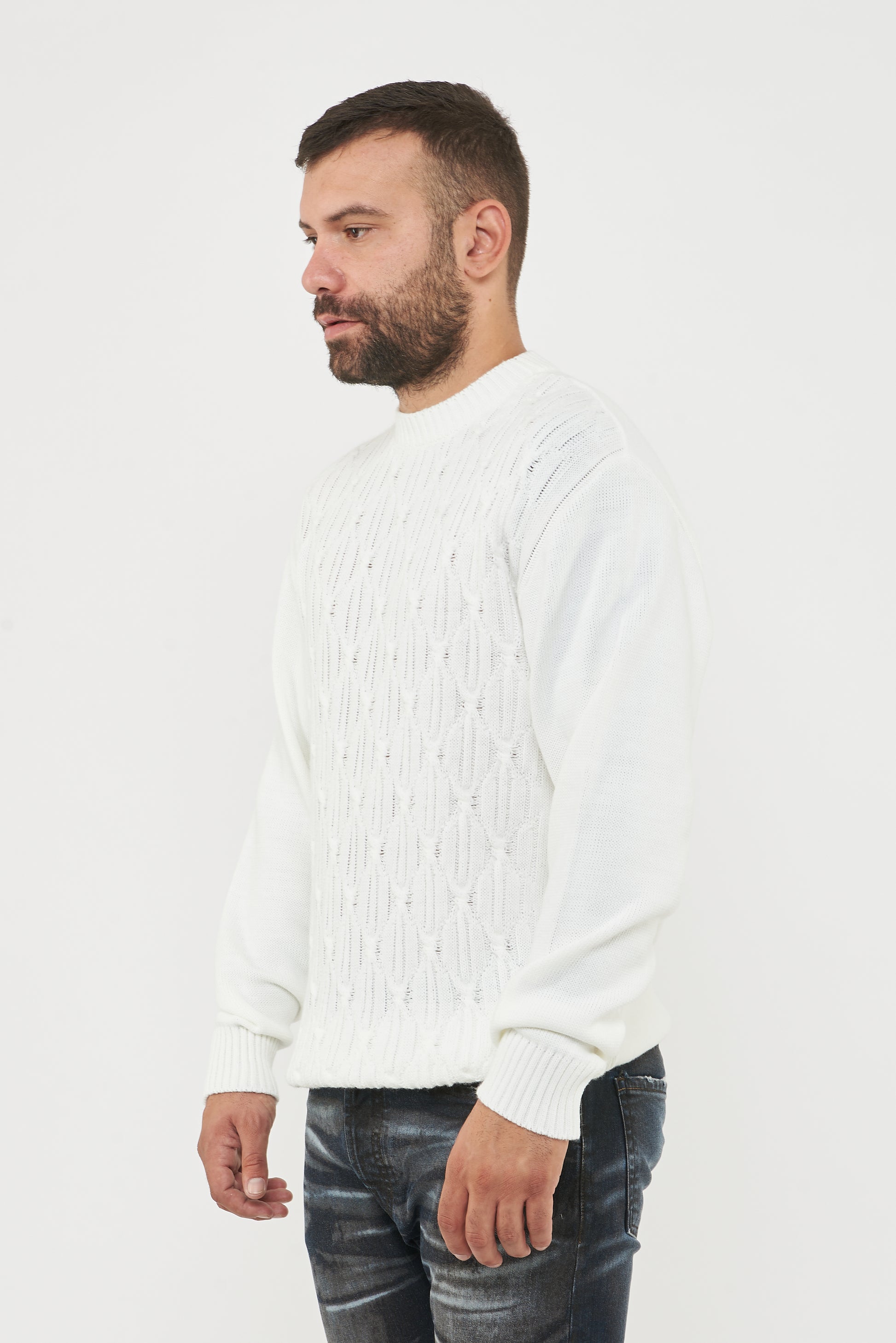 Maglione a girocollo realizzato in morbida maglia lavorata con motivo a trecce geometriche sul davanti. Un capo versatile e confortevole , ideale per la stagione invernale grazie alla sua texture calda ma traspirante. Polsini e fondo a costine per una vestibilità ottimale . Perfetto da abbinare sia a un look casual con jeans che a un outfit più elegante con pantaloni.
