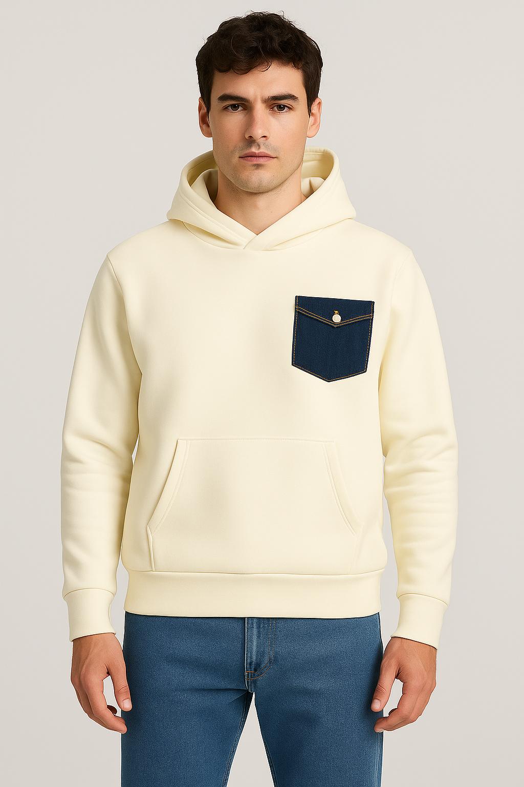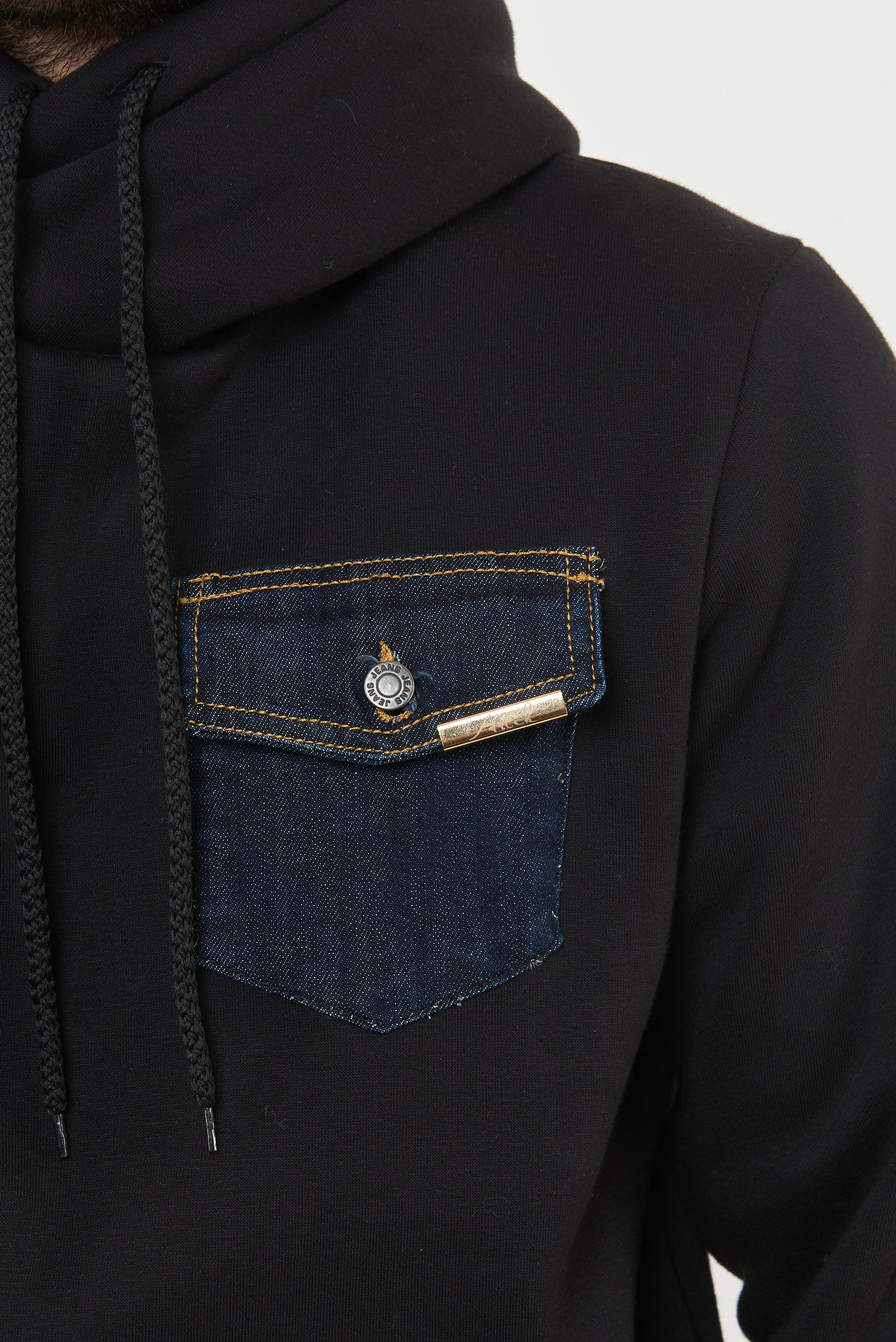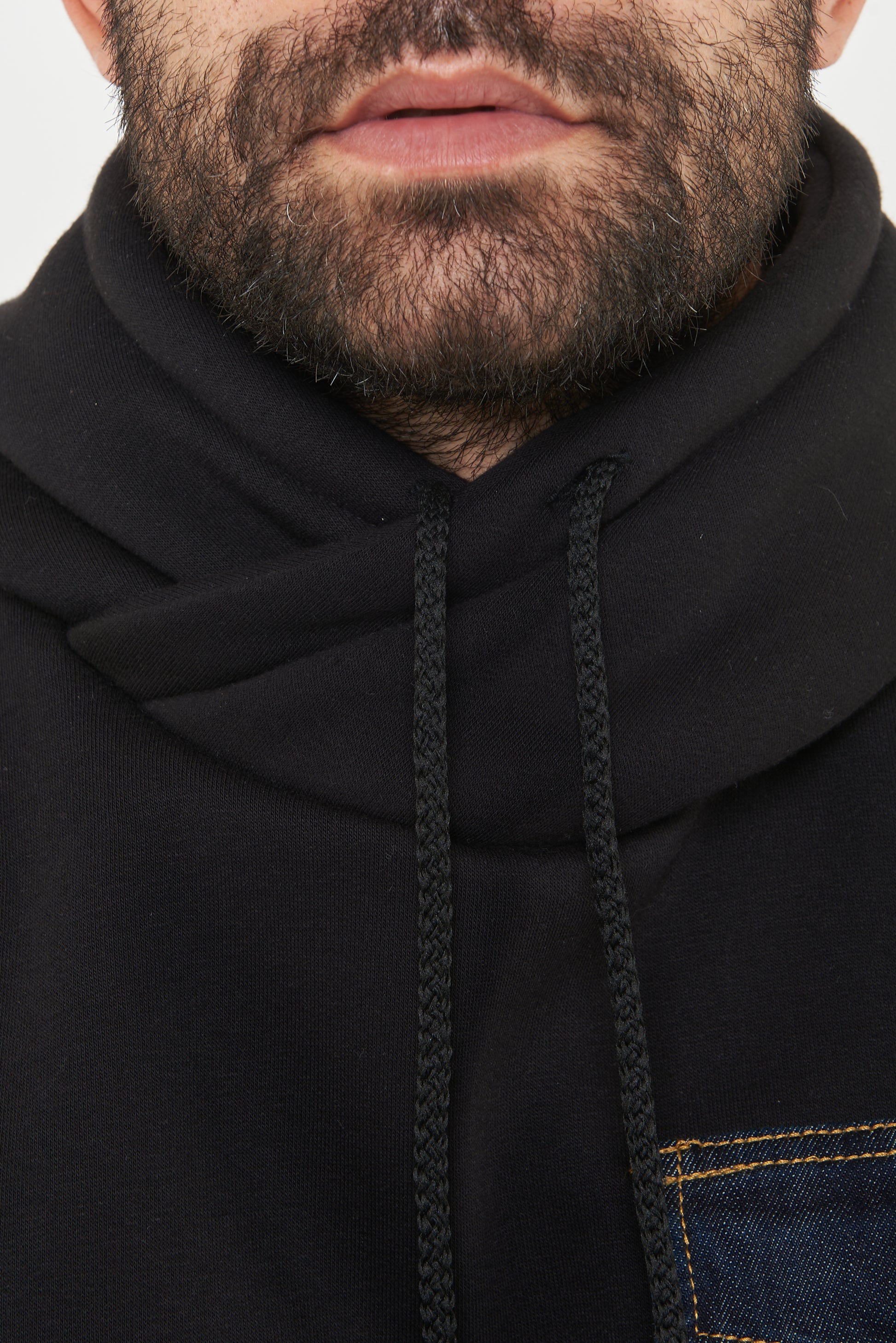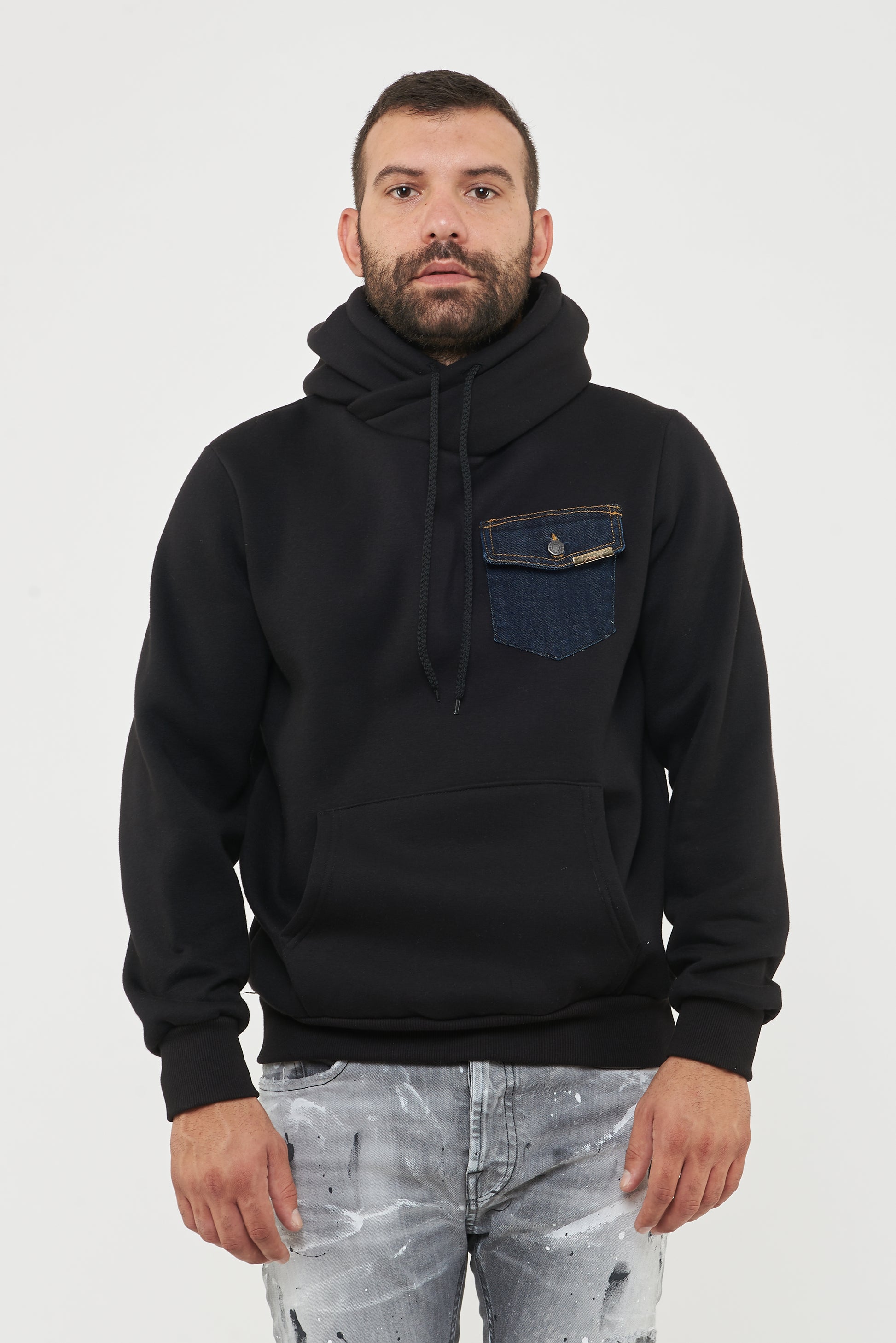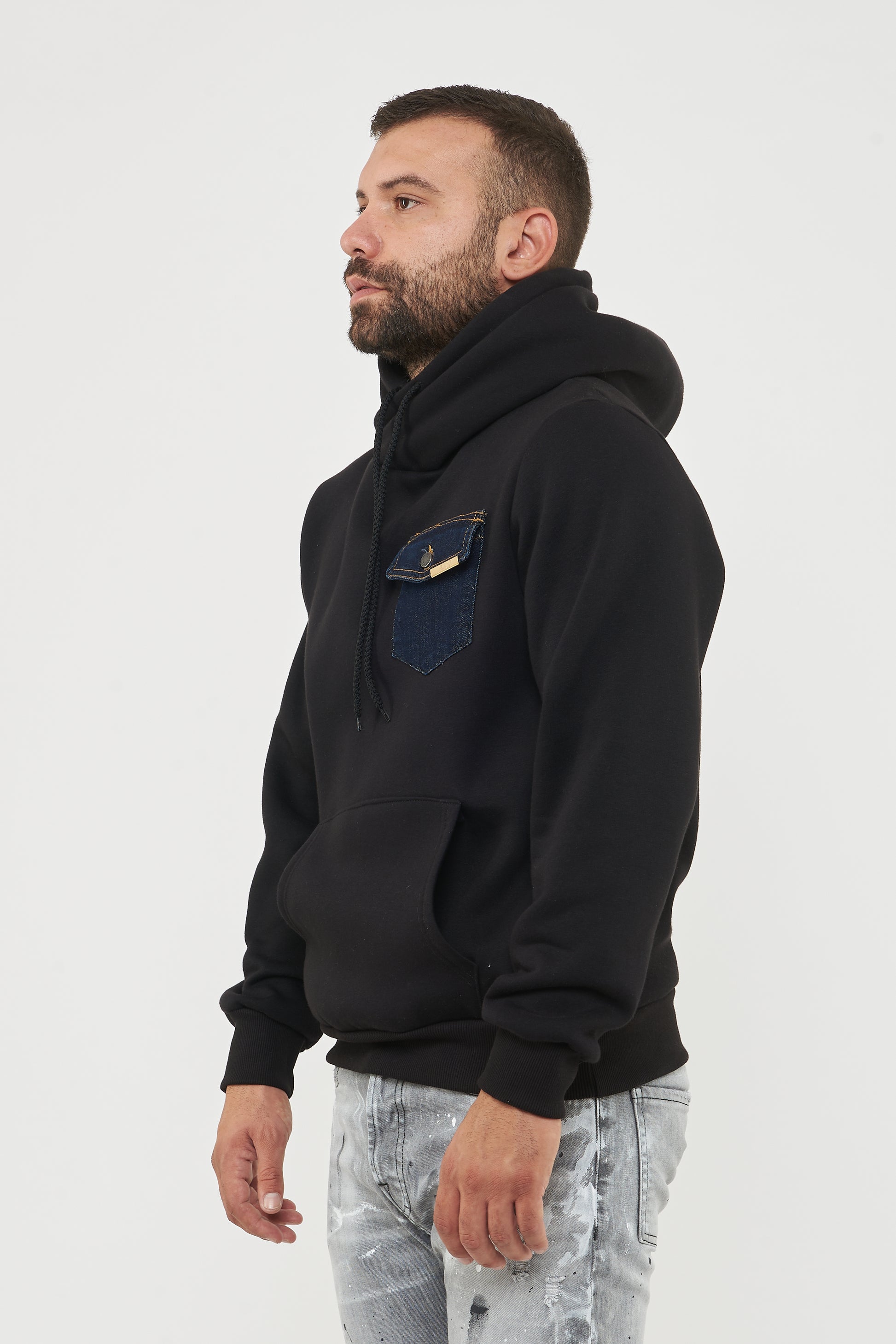 Felpa con cappuccio e tasca in denim . Aggiungi un tocco unico al tuo stile con questa felpa nera dal design moderno. Realizzata in morbido cotone , garantisce comfort e calore per ogni occasione. Il dettaglio distintivo è la tasca applicata in denim sul petto , che dona carattere e originalità al capo. Dotata di cappuccio regolabile con coulisse e pratica tasca a marsupio frontale , è perfetta per un look casual e contemporaneo