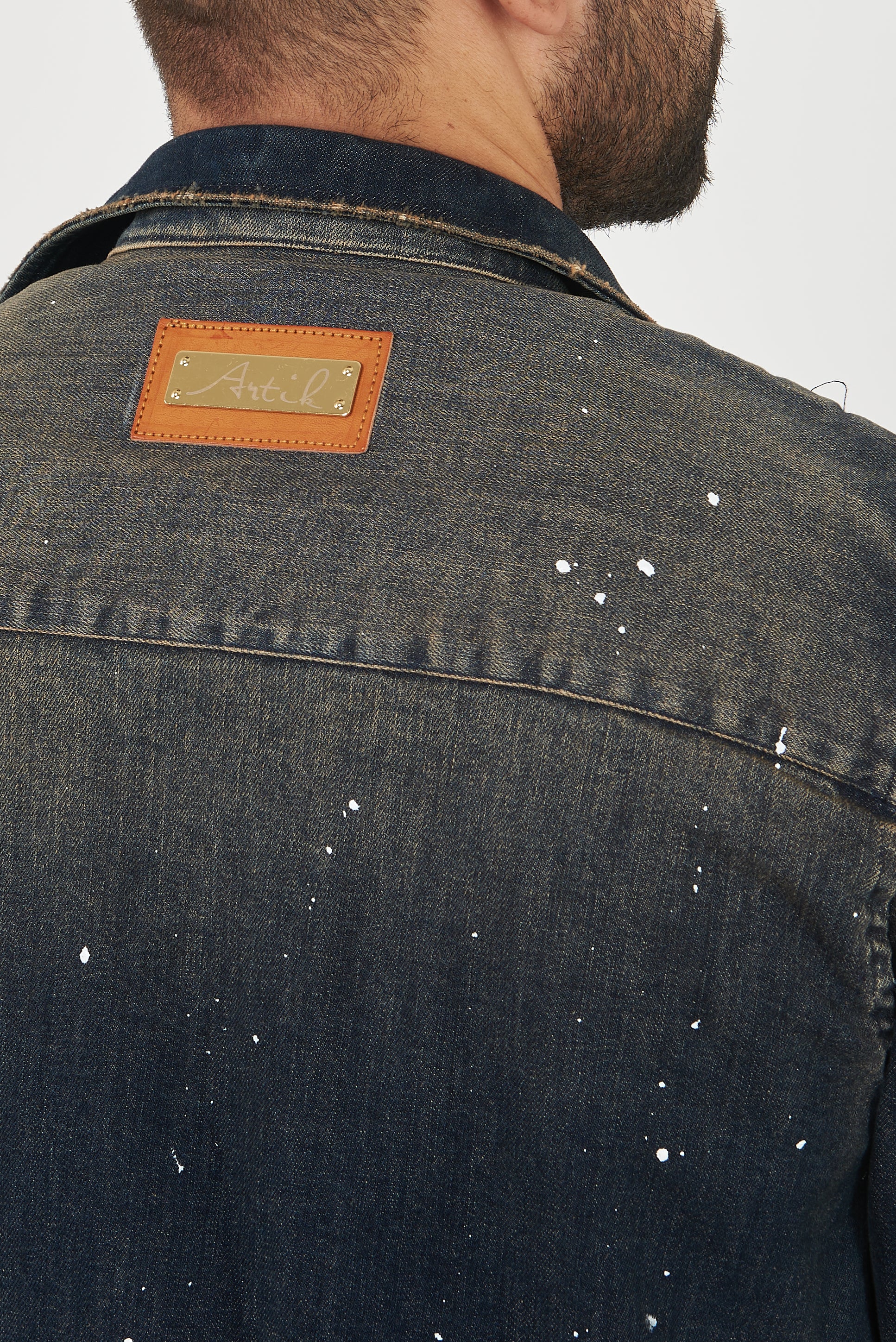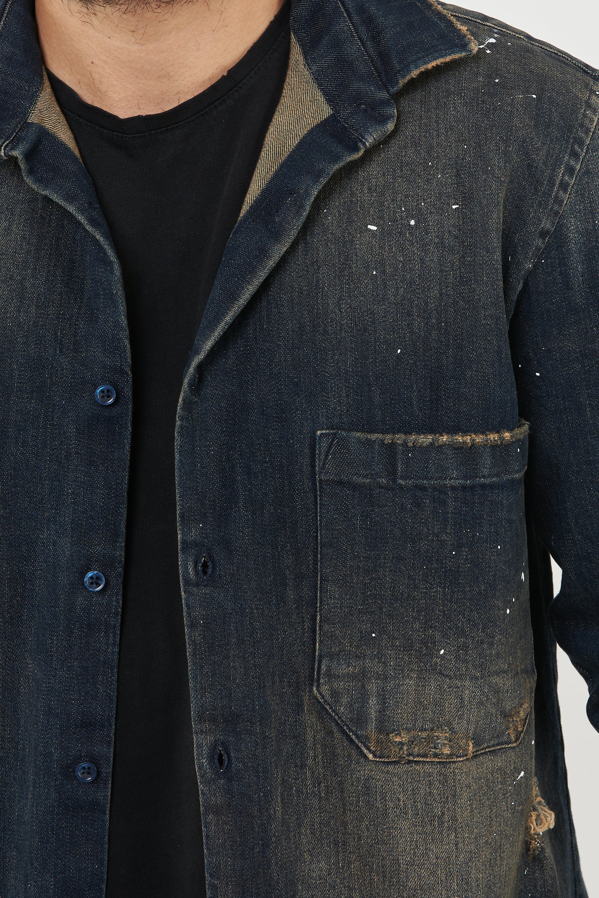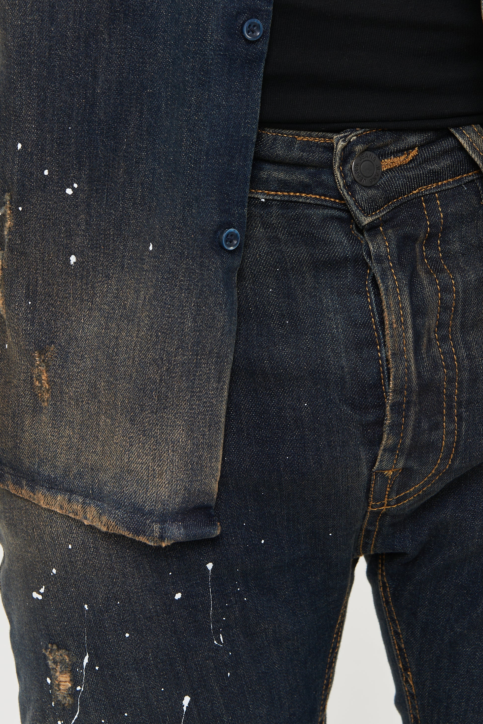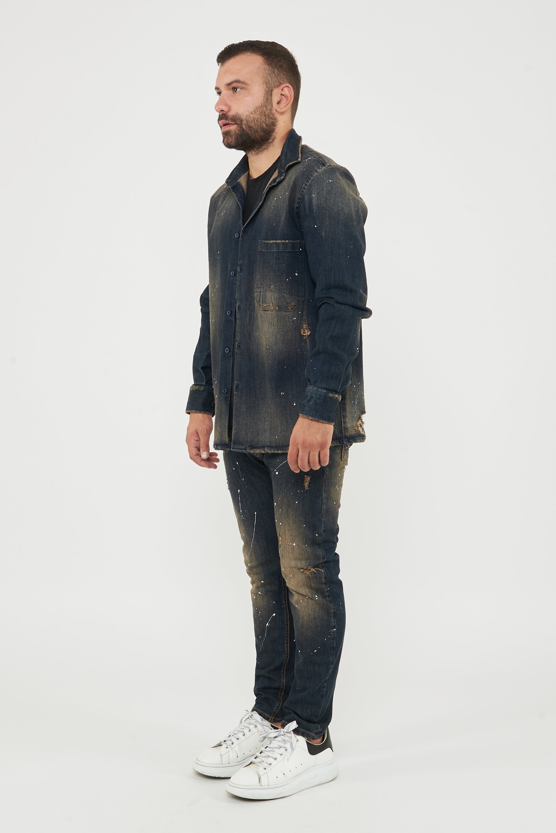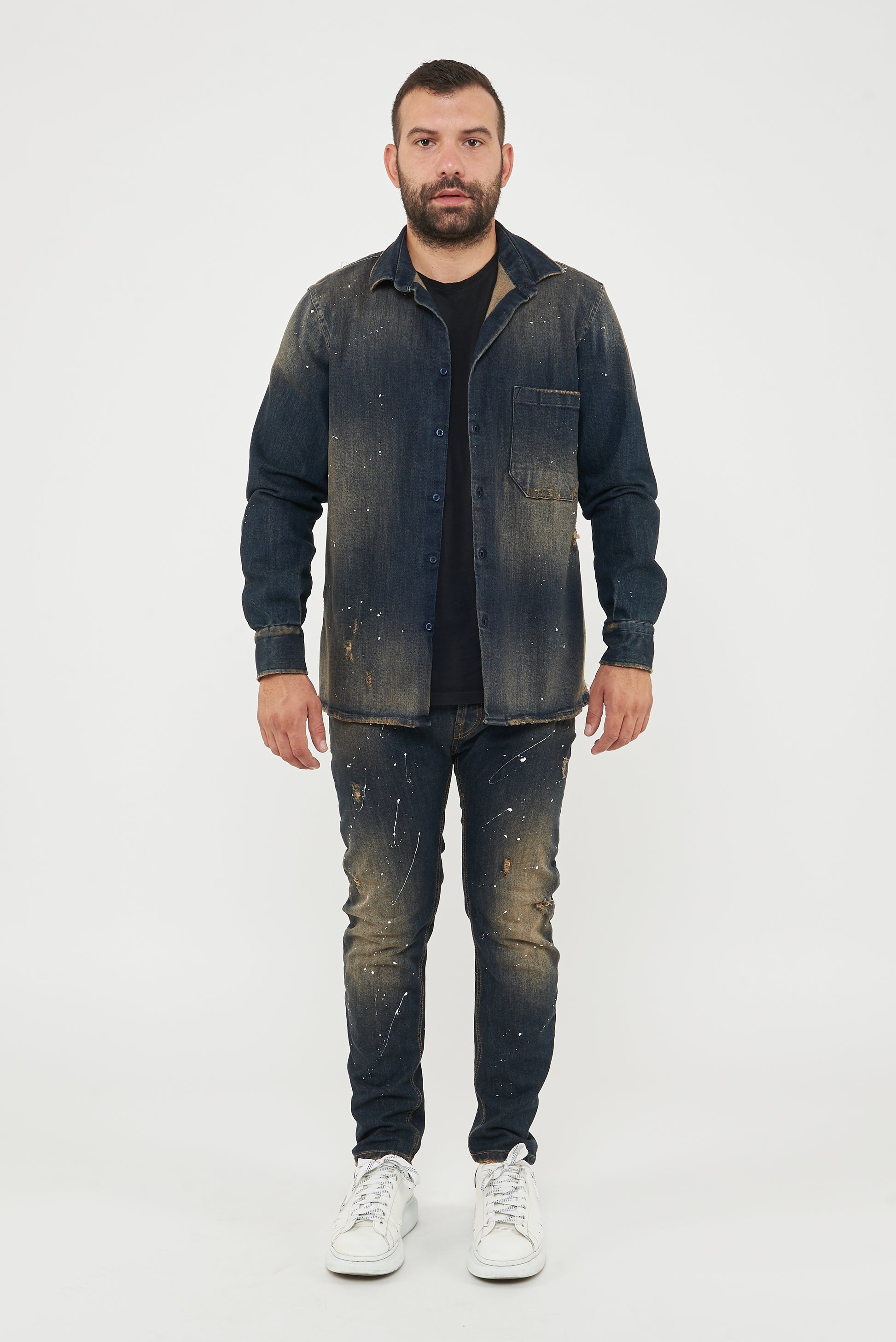 Coordinato camicia più jeans con un trattamento di lavanderia sporcatura a thè con piccole rotture e schizzi di pittura bianchi