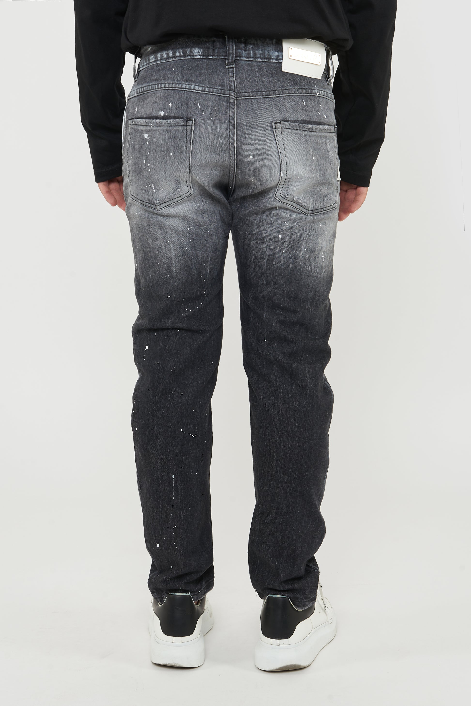 Jeans su tela comfort di colore nero con una vestibilità morbida.Effetto lavaggio nero con toppe sotto le rotture con inserimento di schizzi bianchi.